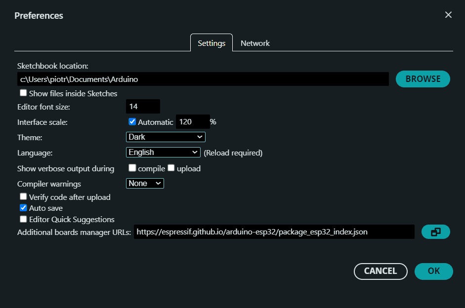 Domyślnie Arduino IDE nie obsługuje płytek ESP32, dlatego musimy dodać odpowiednie repozytorium.