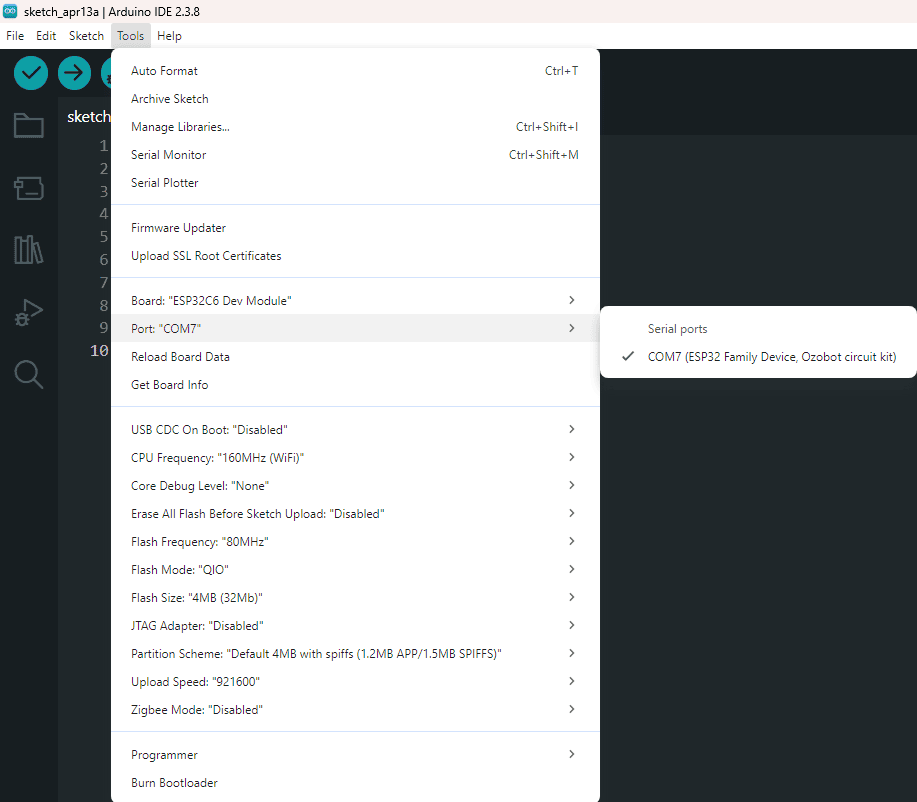 Narzędzia → Płytka → ESP32 Arduino → ESP32C6 Dev Module