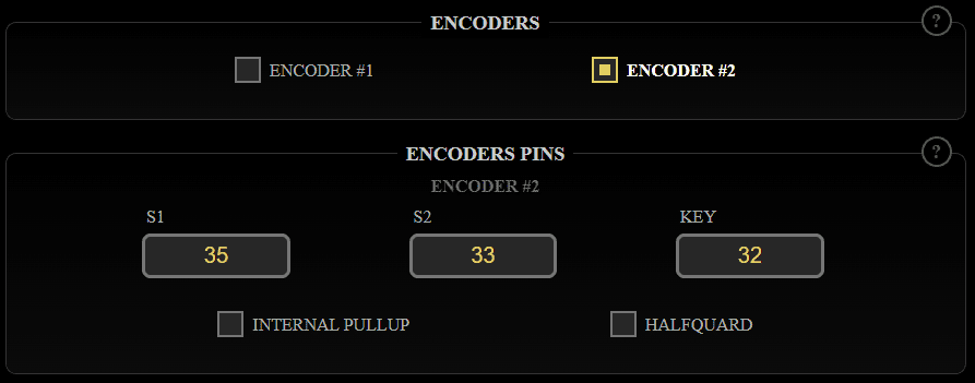 Poniżej, w sekcji ENCODERS PINS, przypisujemy piny zgodnie z wykonanym wcześniej okablowaniem. Pin S1 ustawiamy na GPIO 35, pin S2 na GPIO 33, natomiast pin KEY na GPIO 32, który odpowiada za wciśnięcie przycisku enkodera. Opcje INTERNAL PULLUP oraz HALFQUARD pozostawiamy wyłączone, ponieważ w tej konstrukcji nie są wymagane i enkoder działa poprawnie bez dodatkowych ustawień programowych.