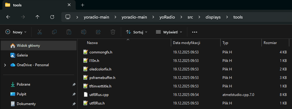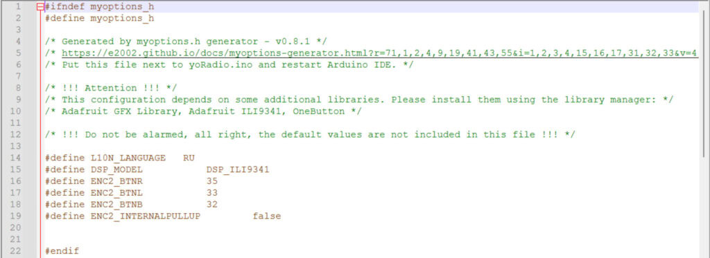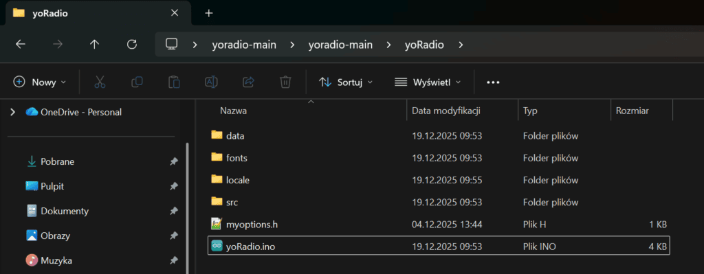 Po pobraniu pliku myoptions.h zapisujemy go na komputerze, a następnie kopiujemy do wypakowanego wcześniej folderu projektu YoRadio, dokładnie do katalogu: