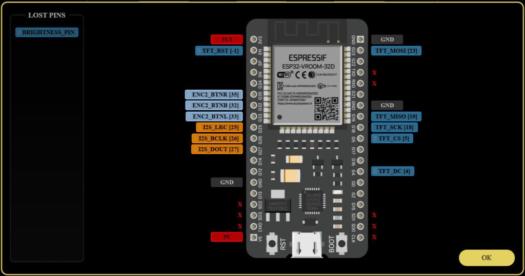 Na tym etapie warto skorzystać z funkcji PREVIEW, która pozwala w czytelny sposób podejrzeć graficzne rozmieszczenie wszystkich wybranych pinów oraz połączeń na module ESP32. Po kliknięciu przycisku PREVIEW generator wyświetli schemat poglądowy, na którym dokładnie widać, które piny ESP32 są przypisane do wyświetlacza TFT, interfejsu I2S, enkodera oraz pozostałych funkcji. Jest to bardzo pomocny krok kontrolny, ponieważ możemy porównać ten widok z naszą rzeczywistą płytką i upewnić się, że wszystkie połączenia zostały wykonane poprawnie i zgodnie z konfiguracją projektu, zanim przejdziemy dalej do kompilacji i wgrywania oprogramowania.