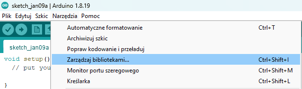 W tym celu uruchamiamy Arduino IDE, a następnie otwieramy Menedżer bibliotek, korzystając ze skrótu klawiszowego Ctrl + Shift + I. Alternatywnie można wejść w menu Szkic → Dołącz bibliotekę → Zarządzaj bibliotekami, jednak skrót klawiszowy jest najszybszą metodą.