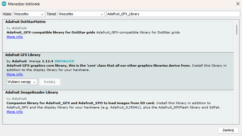 Po otwarciu Menedżera bibliotek w polu wyszukiwania wpisujemy Adafruit GFX, a następnie instalujemy bibliotekę Adafruit_GFX_Library (jeżeli jest już zainstalowana, nie musimy wykonywać tej czynności ponownie). Po zakończeniu instalacji zamykamy Menedżer bibliotek i Arduino IDE.