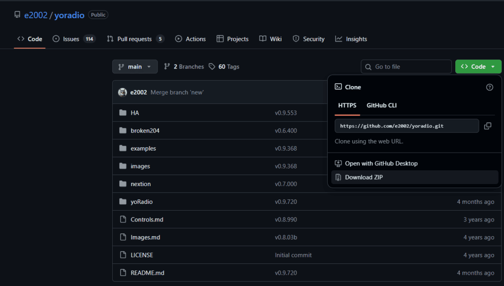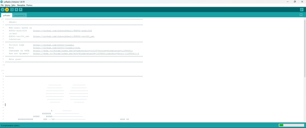 Skoro radio jest już w pełni zmontowane od strony sprzętowej, możemy przejść do kolejnego etapu, czyli przygotowania oprogramowania YoRadio, które odpowiada za obsługę wyświetlacza, dźwięku, Wi-Fi oraz interfejsu webowego. Cały projekt jest dostępny publicznie na platformie GitHub, dzięki czemu mamy dostęp do aktualnych wersji kodu oraz wszystkich niezbędnych plików konfiguracyjnych.