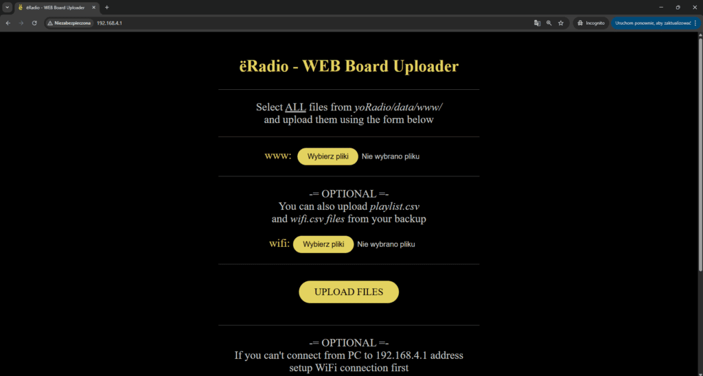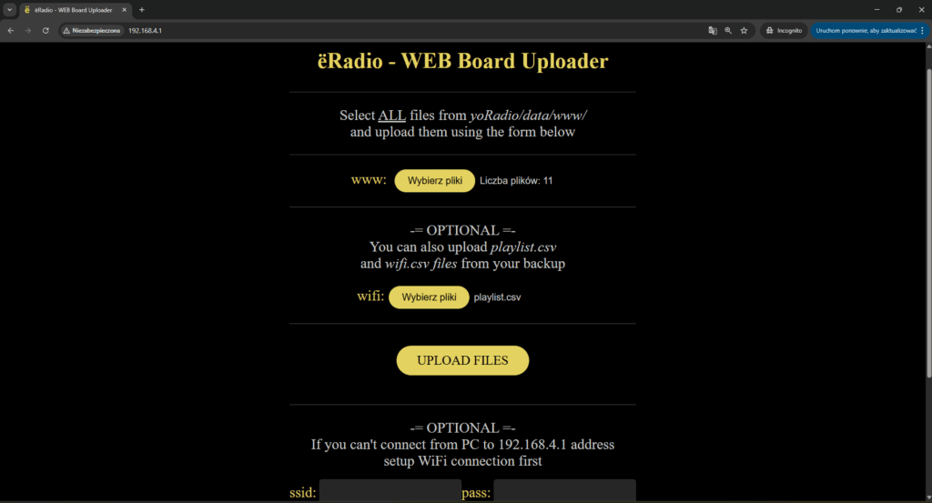 Na tej stronie wgrywamy pliki strony WWW z katalogu yoRadio/data/www/, które odpowiadają za wygląd oraz działanie interfejsu webowego radia. Dodatkowo w tym poradniku udostępniamy gotowy plik playlist.csv z 7 przykładowymi, podstawowymi stacjami radiowymi, przygotowanymi specjalnie pod YoRadio, plik ten można pobrać z linku, który podajemy poniżej, i wgrać bezpośrednio przez ten formularz.