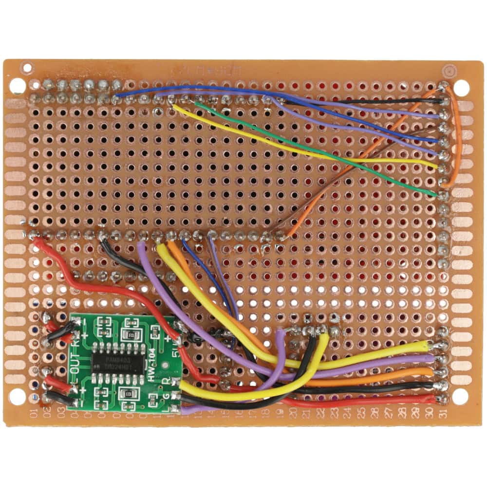 W tym kroku montujemy wzmacniacz audio PAM8403 po spodniej stronie płytki uniwersalnej, mocując go za pomocą taśmy dwustronnej lub niewielkiej ilości kleju na gorąco, tylko w takiej ilości, aby moduł stabilnie trzymał się płytki i nie przemieszczał się podczas dalszych prac. Następnie wykonujemy wszystkie niezbędne połączenia elektryczne całego układu, łącząc mikrokontroler ESP32 z wyświetlaczem TFT, przetwornikiem DAC PCM5102 oraz enkoderem obrotowym zgodnie z wcześniej przygotowanym schematem. W dalszej kolejności łączymy przetwornik DAC z wzmacniaczem PAM8403, podając sygnały audio lewego i prawego kanału oraz wspólną masę. Kolejnym etapem jest podłączenie wzmacniacza do złączy głośnikowych poprzez listwę śrubową ARK, wyprowadzając sygnały L+, L− oraz R+, R− i pamiętając, że są to wyjścia mostkowe, których nie wolno łączyć z masą. Na końcu doprowadzamy zasilanie wzmacniacza, czyli napięcie 5 V oraz masę ze wspólnej linii zasilania, dbając o solidne luty i estetyczne prowadzenie przewodów, ponieważ na tym etapie powstaje kompletne okablowanie całego radia.