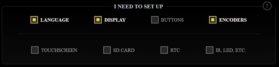 W kolejnym kroku generatora przechodzimy do sekcji I NEED TO SET UP, w której wybieramy funkcje, jakie ma posiadać nasze YoRadio. W naszym projekcie oznaczamy opcje LANGUAGE, DISPLAY oraz ENCODERS, ponieważ chcemy mieć możliwość ustawienia języka interfejsu, korzystamy z wyświetlacza TFT do prezentowania informacji oraz sterujemy radiem za pomocą enkodera obrotowego. Pozostałe opcje, takie jak BUTTONS, TOUCHSCREEN, SD CARD, RTC oraz IR, LED, ETC., pozostawiamy niezaznaczone, ponieważ w tej konstrukcji nie wykorzystujemy dodatkowych przycisków, ekranu dotykowego, karty SD, zegara czasu rzeczywistego ani zewnętrznych modułów sterowania, co upraszcza konfigurację i w pełni odpowiada zastosowanemu sprzętowi.