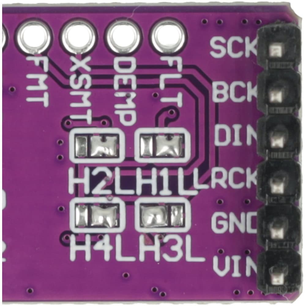 Pin H1L należy ustawić w stanie LOW, co wybiera standardowy filtr cyfrowy o wyższej jakości dźwięku. Pin H2L również powinien pozostać w stanie LOW, dzięki czemu funkcja de-emfazy jest wyłączona, co jest zalecane dla współczesnych strumieni audio. Pin H3L należy ustawić w stanie HIGH, co wyłącza tryb soft-mute i umożliwia natychmiastowe odtwarzanie dźwięku po uruchomieniu. Pin H4L pozostawiamy w stanie LOW, wybierając standardowy format danych audio I2S, w pełni kompatybilny z ESP32.