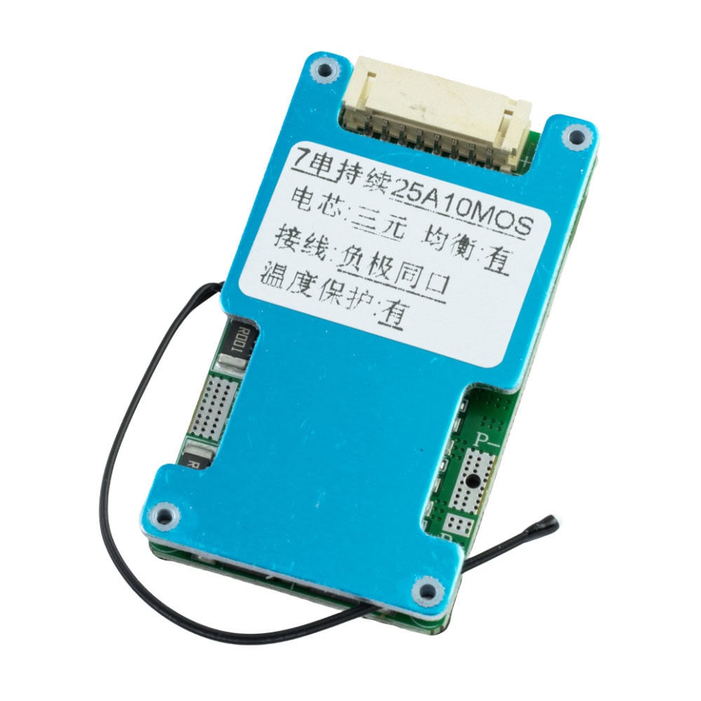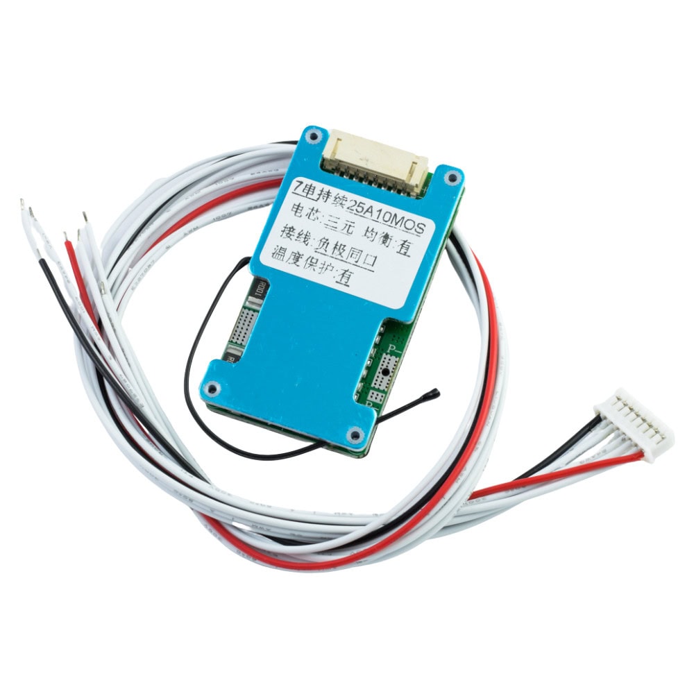 Moduł BMS 7S 25A to zabezpieczenie do akumulatorów Li-Ion, obsługujące 7 ogniw 18650 lub podobnych. Pracuje w zakresie napięcia 25,2 V – 29,4 V i posiada balanser oraz zabezpieczenia: przeciążeniowe, zwarciowe, temperaturowe, przed przeładowaniem i rozładowaniem. Dzięki czujnikowi NTC zapewnia bezpieczne działanie zestawu bateryjnego.