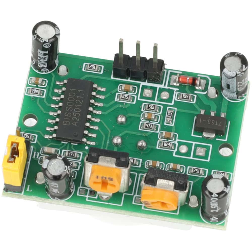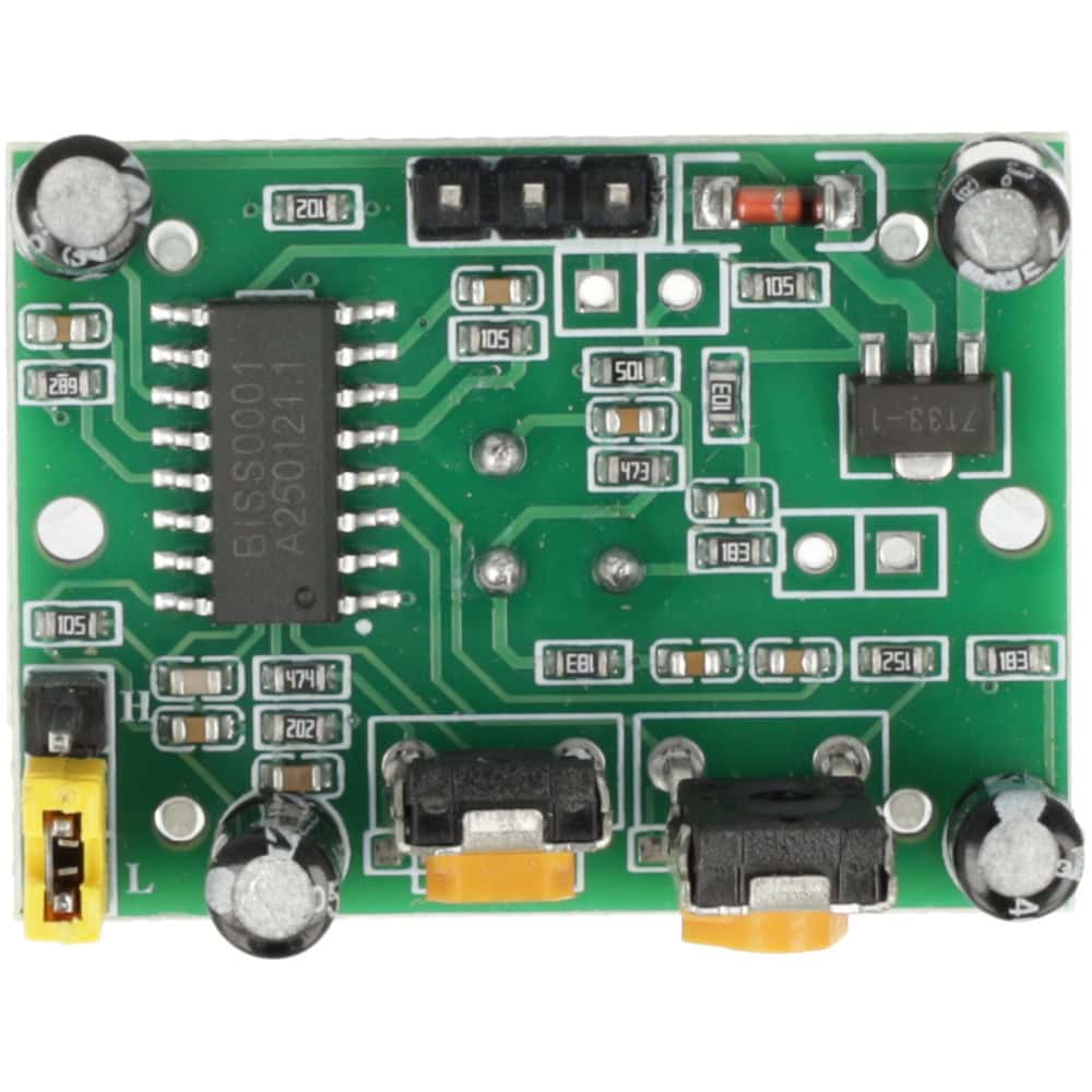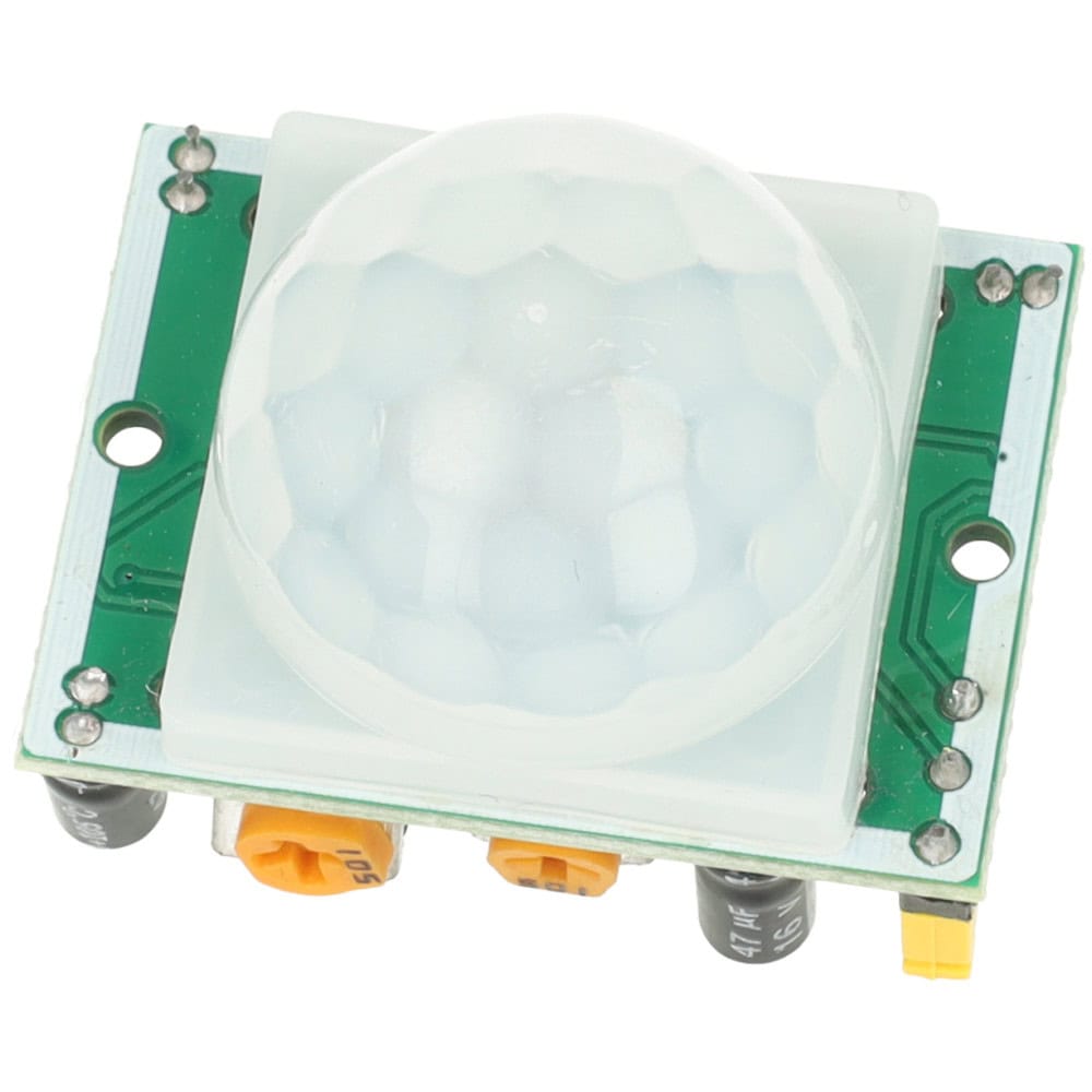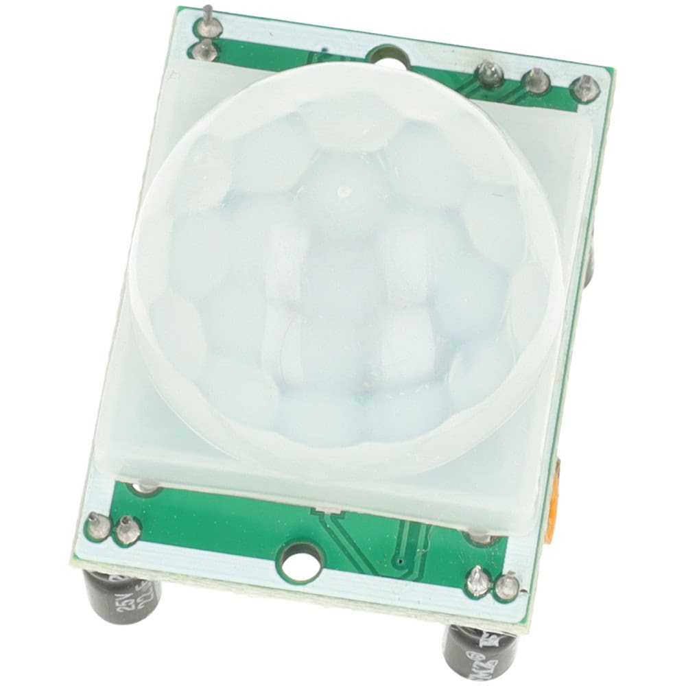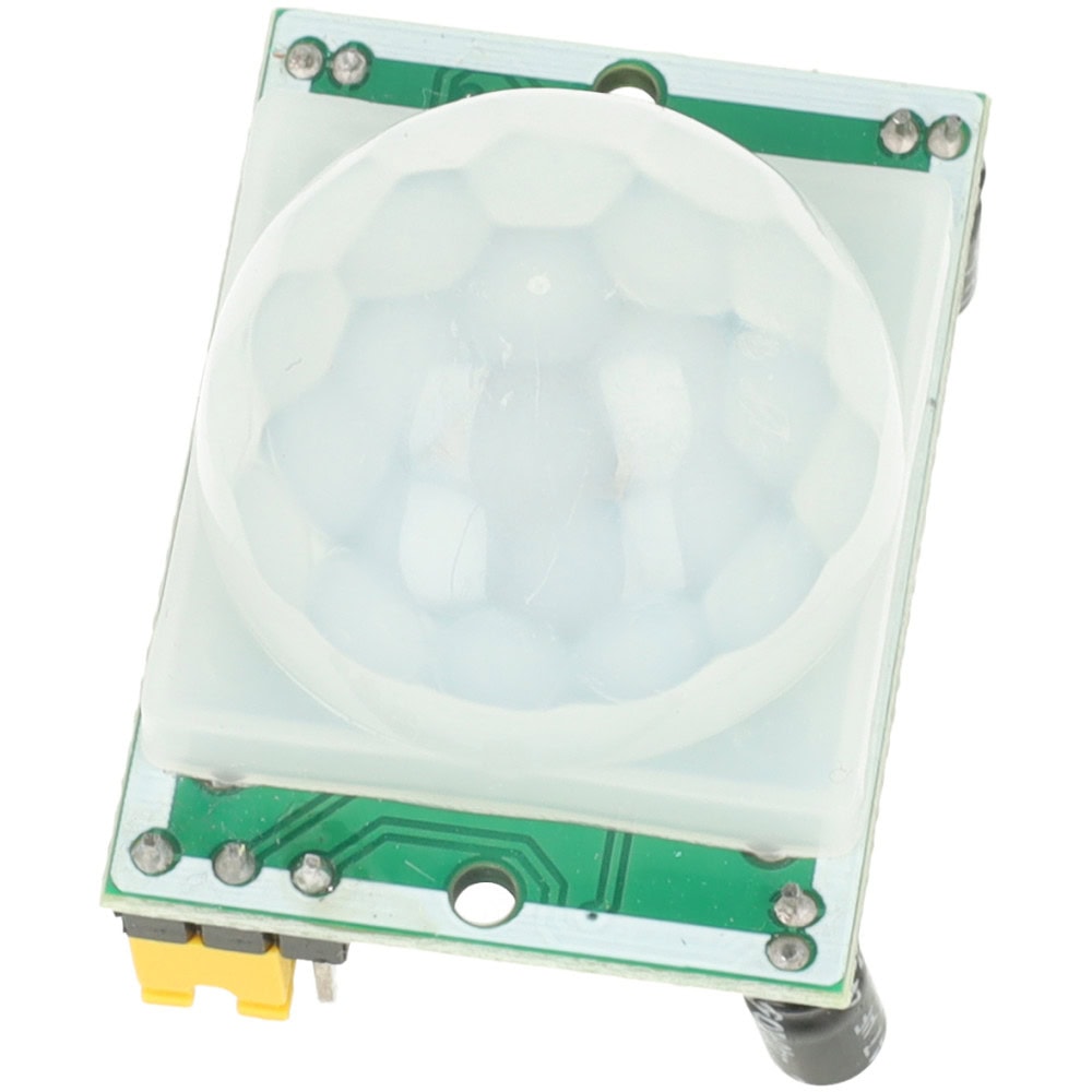 Czujnik ruchu PIR HC-SR501 w kolorze zielonym to precyzyjne urządzenie elektroniczne oparte na pasywnym detektorze podczerwieni.