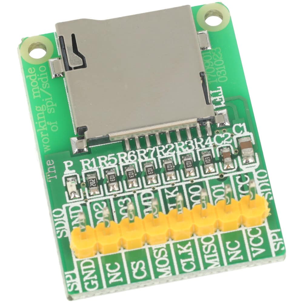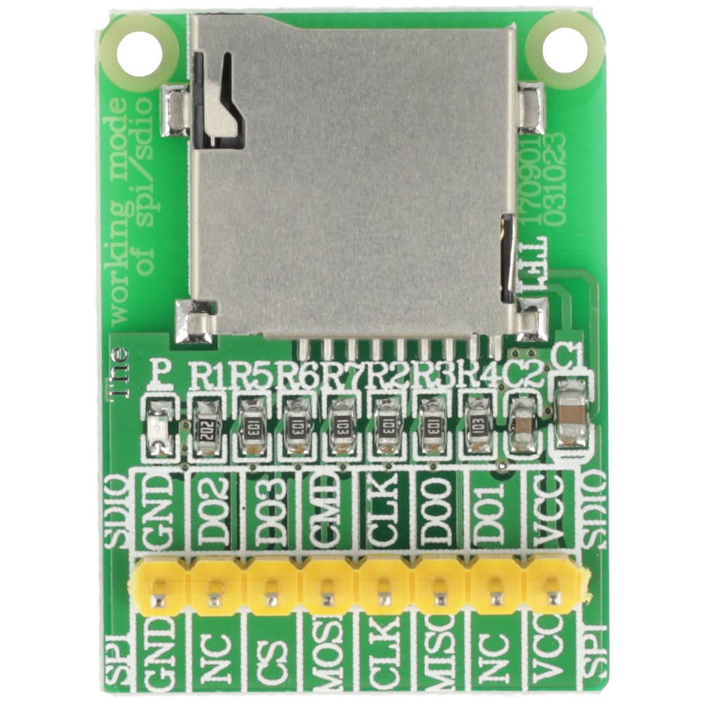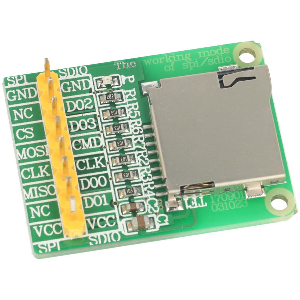 🔌 Zasilanie: 3,3 V 🔄 Interfejs: SPI lub SDIO 💾 Gniazdo kart: microSD z wyrzutnikiem 📡 Zgodność: Arduino, ESP32, STM32 i inne mikrokontrolery 🧷 Złącza: wlutowane goldpiny w rastrze 2,54 mm 📏 Wymiary: 23 x 31 mm ⚖️ Waga: 3,51 g