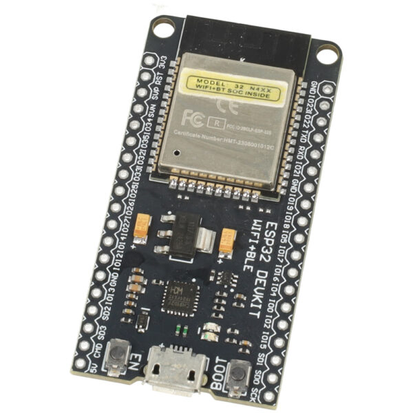 Moduł ESP32 to dwurdzeniowy, 32-bitowy mikrokontroler, następca ESP8266, oferujący WiFi 802.11 b/g/n oraz Bluetooth Low Energy 4.2. Posiada 520 kB RAM, 4 MB FLASH, 32 GPIO i interfejsy UART, SPI, I2C, I2S, PWM. Płytka w formacie podobnym do NodeMCU programowana przez micro-USB w Arduino IDE.