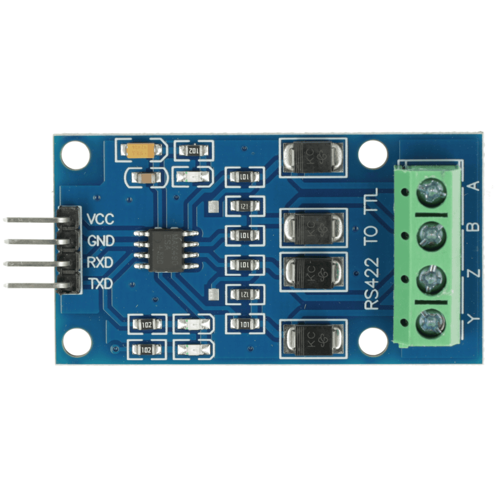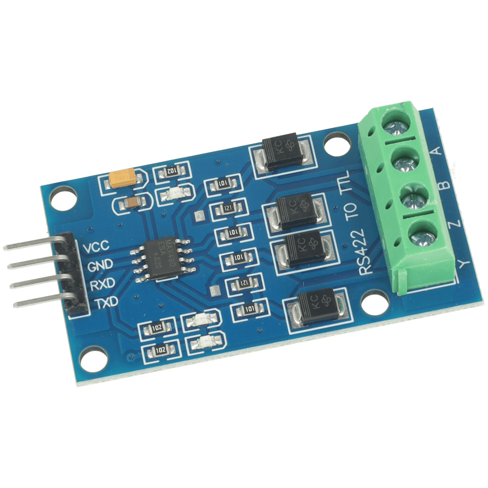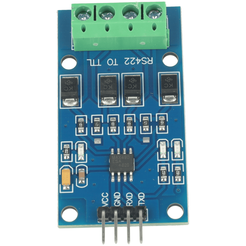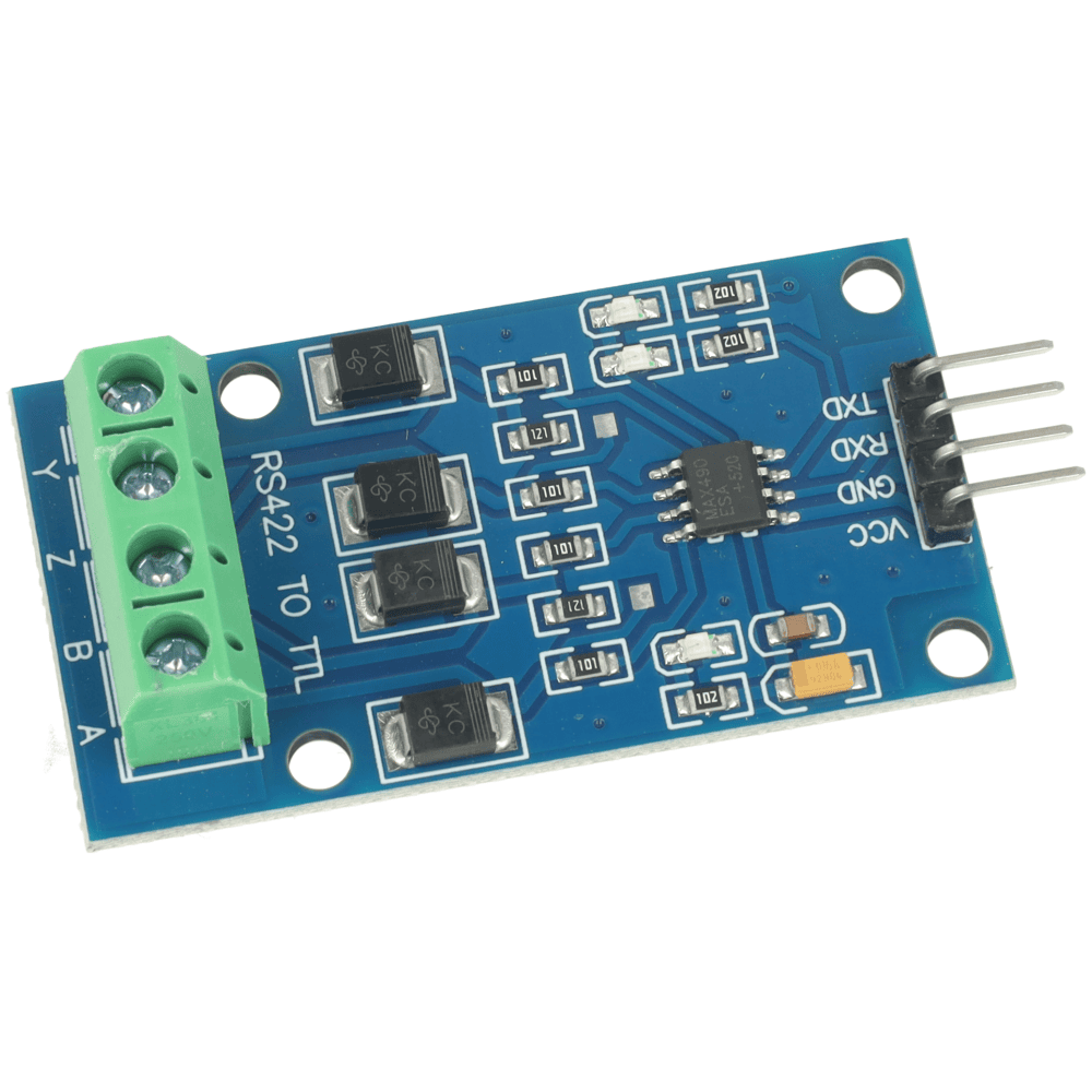 Konwerter RS422 – TTL z układem MAX490 umożliwia dwukierunkową komunikację różnicową na odległość do 1000 m z prędkością do 2,5 Mb/s. Jest kompatybilny z logiką TTL 5 V. Wbudowane zabezpieczenie ESD 15 kV, diody TVS oraz rezystory 120 Ω zapewniają odporność na zakłócenia i bezpieczną pracę w środowisku przemysłowym.