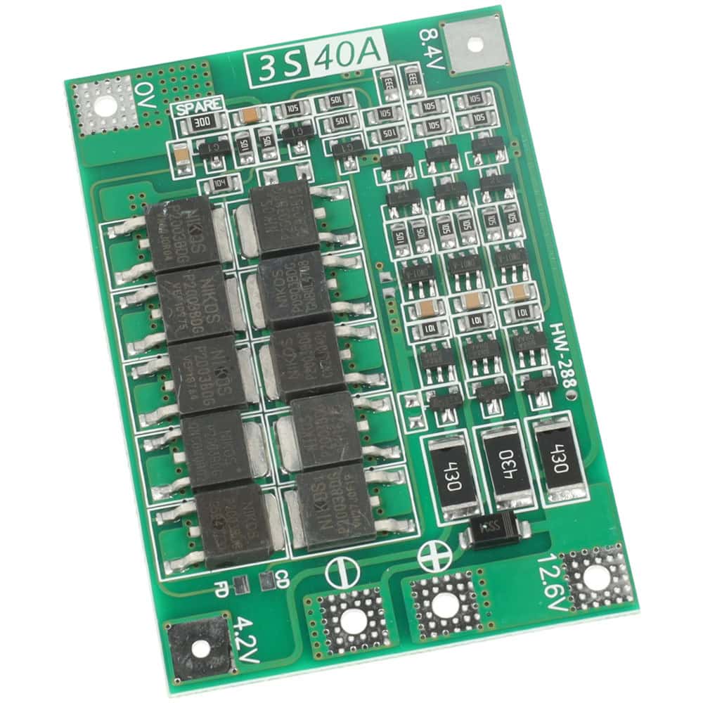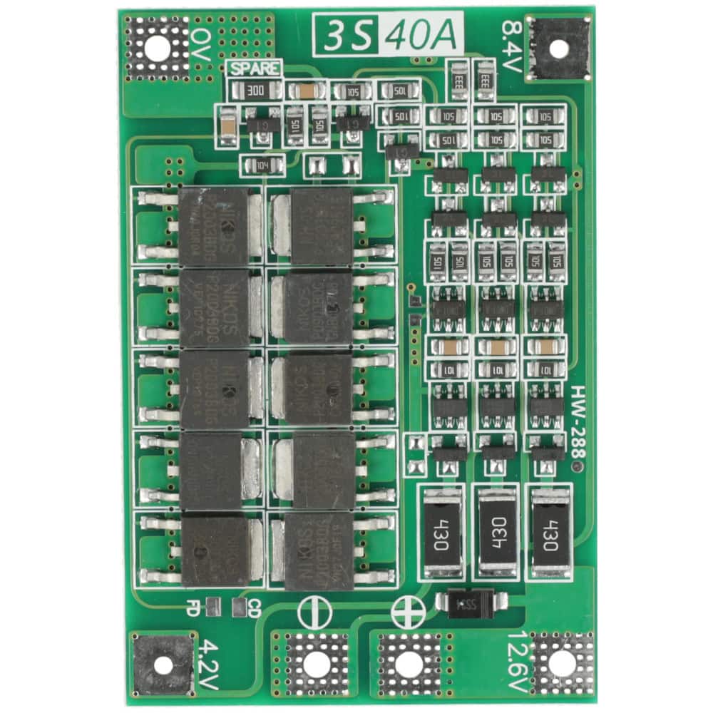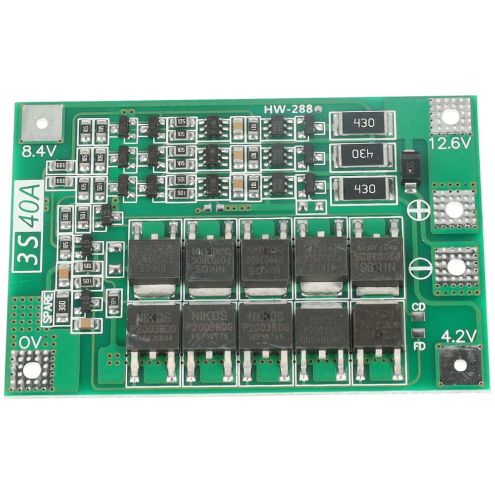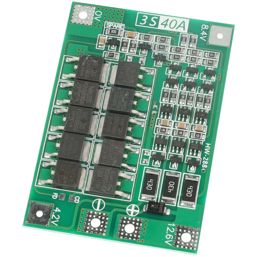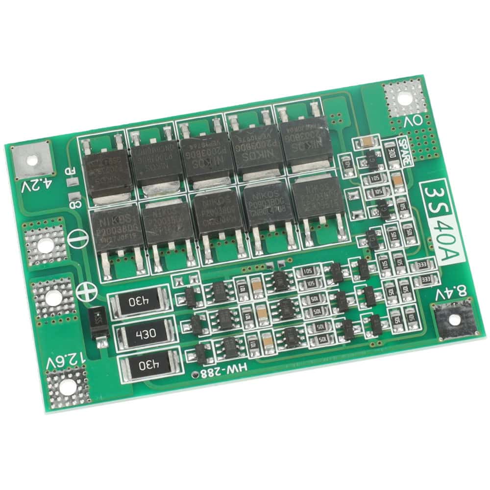 Zaawansowany moduł BMS do obsługi akumulatorów Li-Ion w konfiguracji 3S (3 ogniwa w szeregu). Zapewnia prąd ciągły do 40 A, ochronę przed przeciążeniem, przeładowaniem i rozładowaniem oraz obsługę pakietów 3S1P i 3S2P.