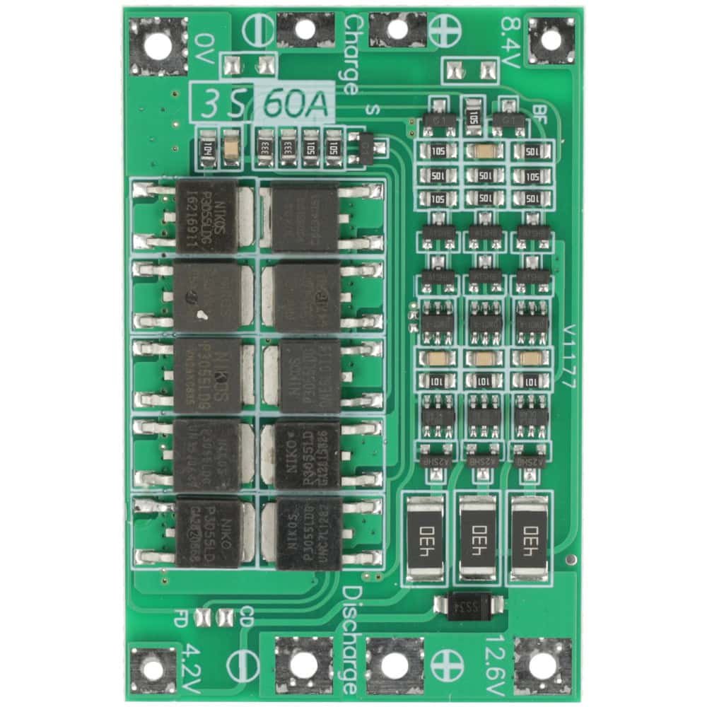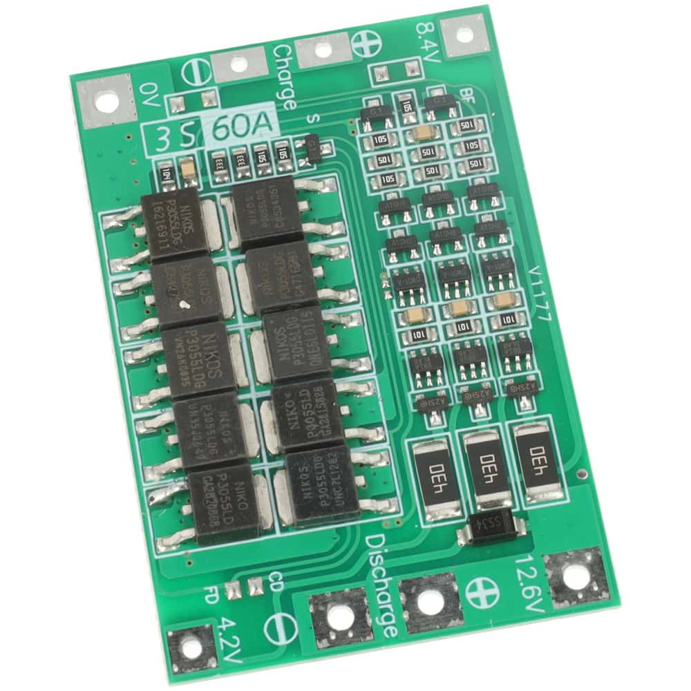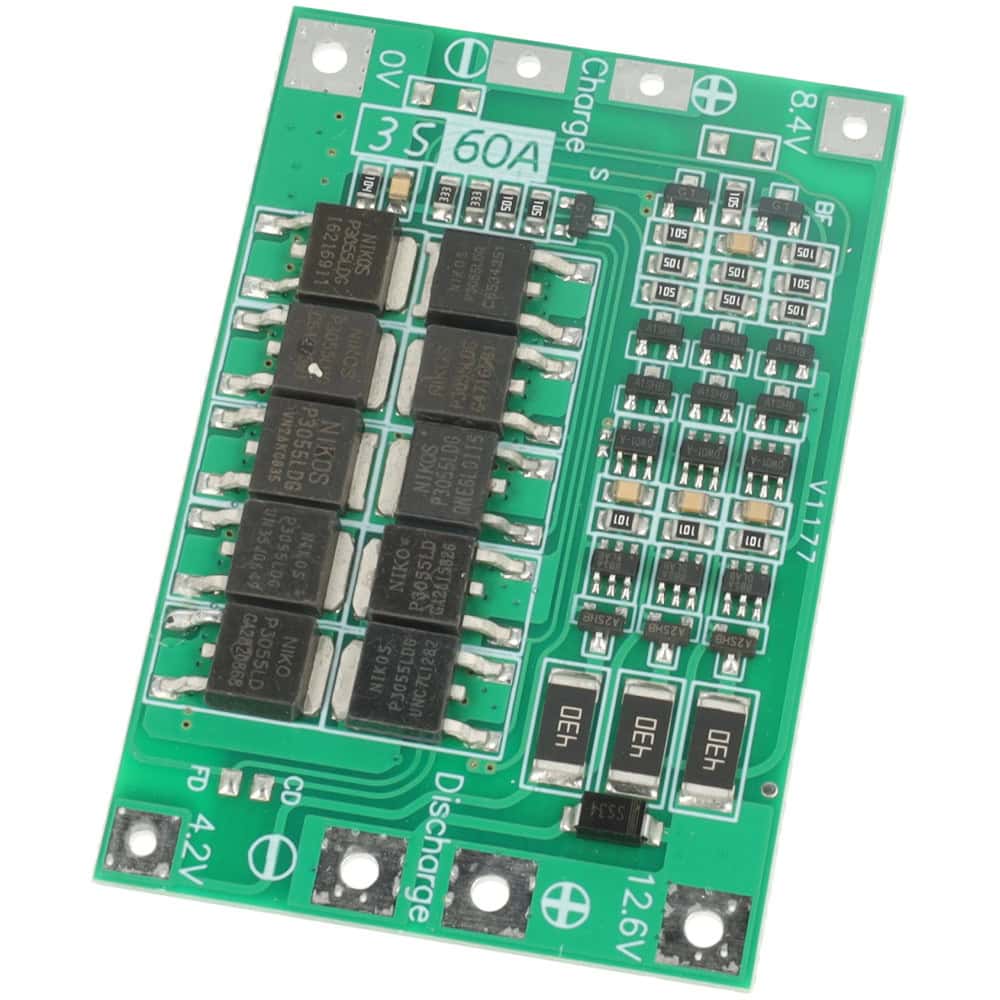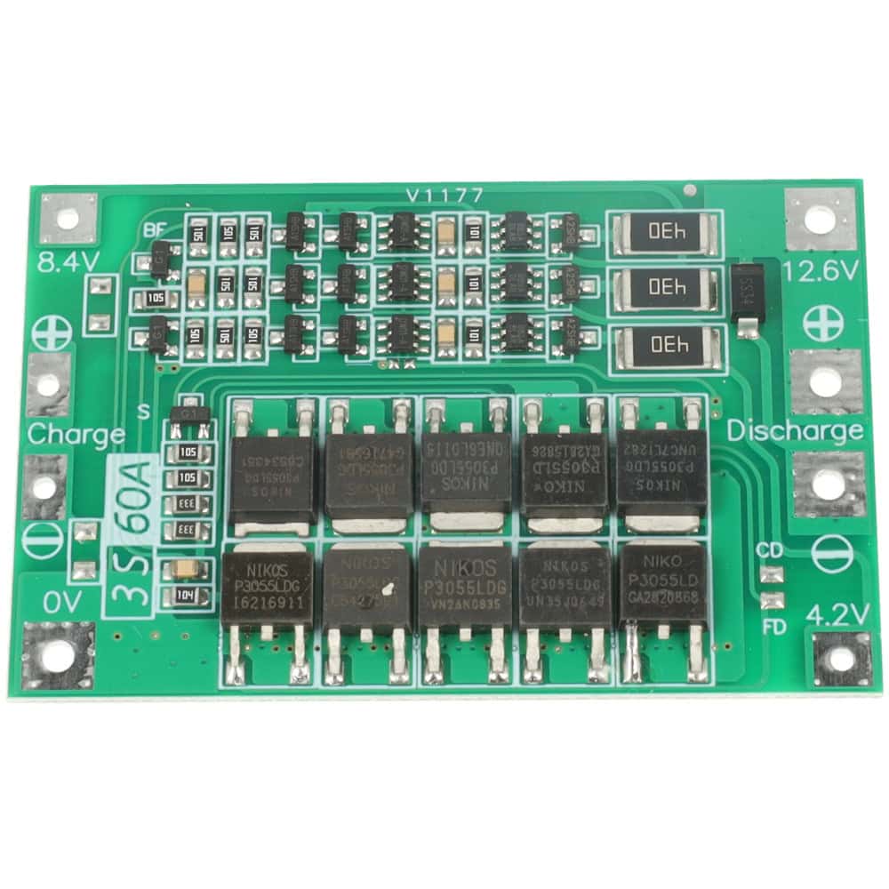 Moduł BMS do akumulatorów Li-Ion 18650 w konfiguracji 3S (3 ogniwa w szeregu), obsługuje napięcie 10,8–12,6 V. Chroni pakiet przed przeciążeniem, przeładowaniem i głębokim rozładowaniem. Maksymalny prąd ciągły to 60 A, a chwilowy 80 A – idealny do zastosowań wymagających wysokiej mocy.