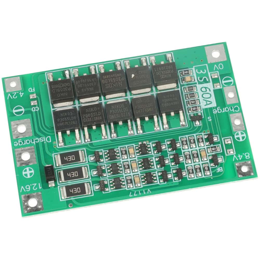 Moduł BMS (Battery Management System) przeznaczony do akumulatorów Li-Ion 18650 w konfiguracji 3S (3 ogniwa w szeregu), obsługujący napięcie w zakresie 10,8 V – 12,6 V.