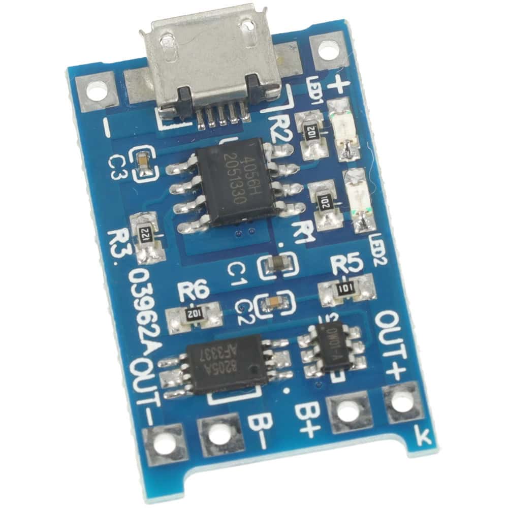 Zasilanie ładowarki TP4056 powinno być w zakresie 4,5 – 5 V. Proces ładowania sygnalizowany jest dwiema diodami LED. Czerwona – ładowanie trwa. Niebieska – ładowanie zakończone.
