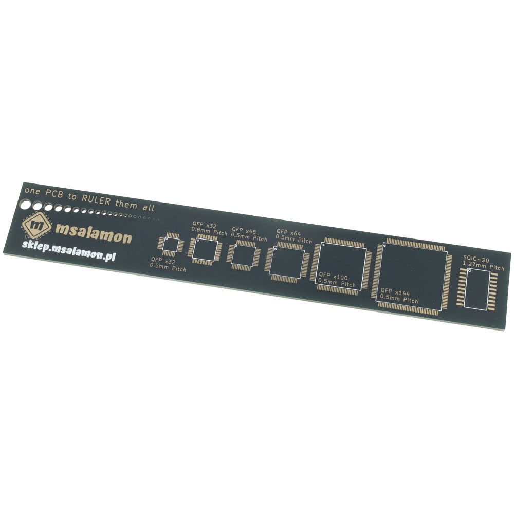 Linijka PCB o długości 15 cm (6 cali). Idealna dla każdego elektronika, ucznia technikum lub studenta elektroniki. Pozłacane pola i matowe wykończenie sprawiają, że jest to bardzo elegancki gadżet!