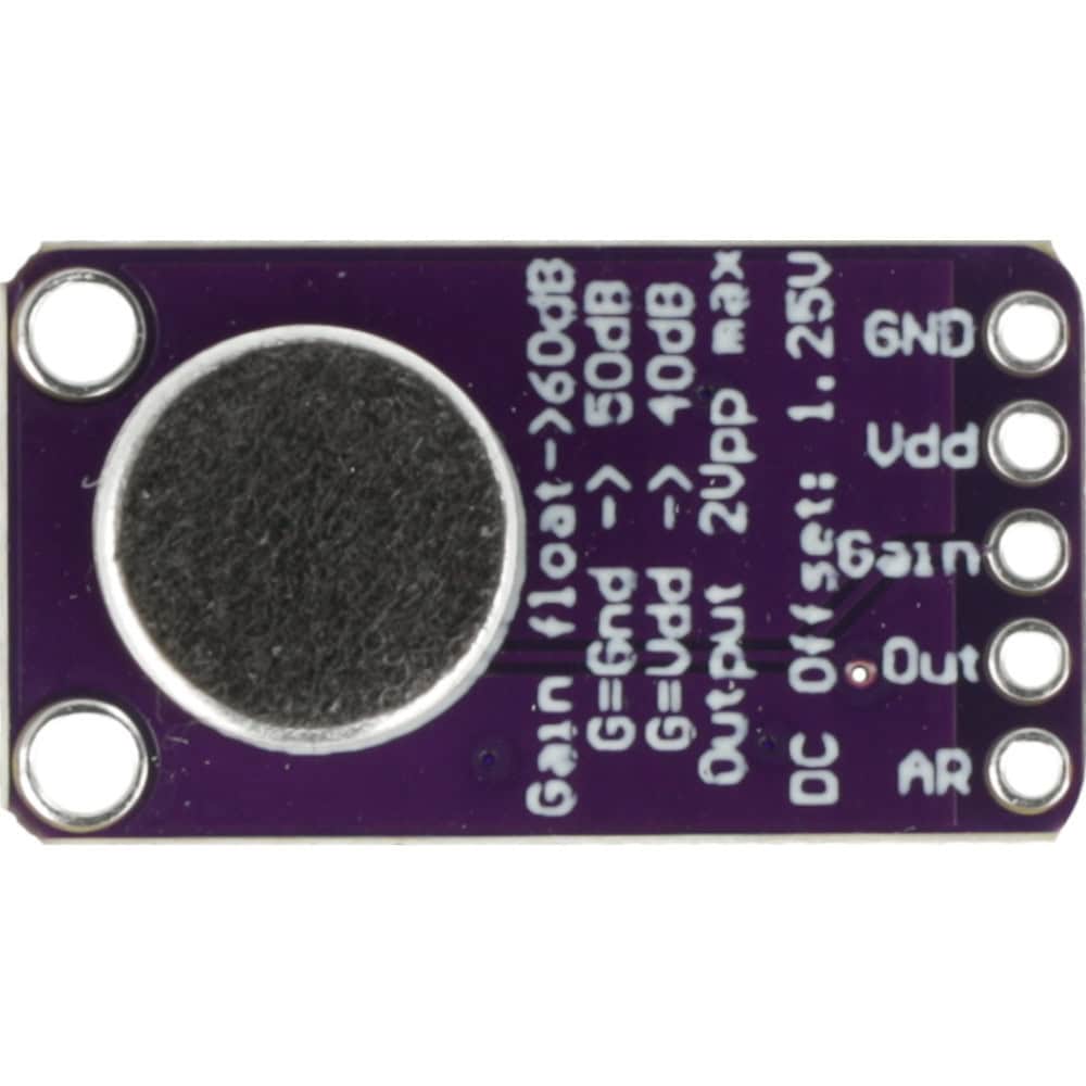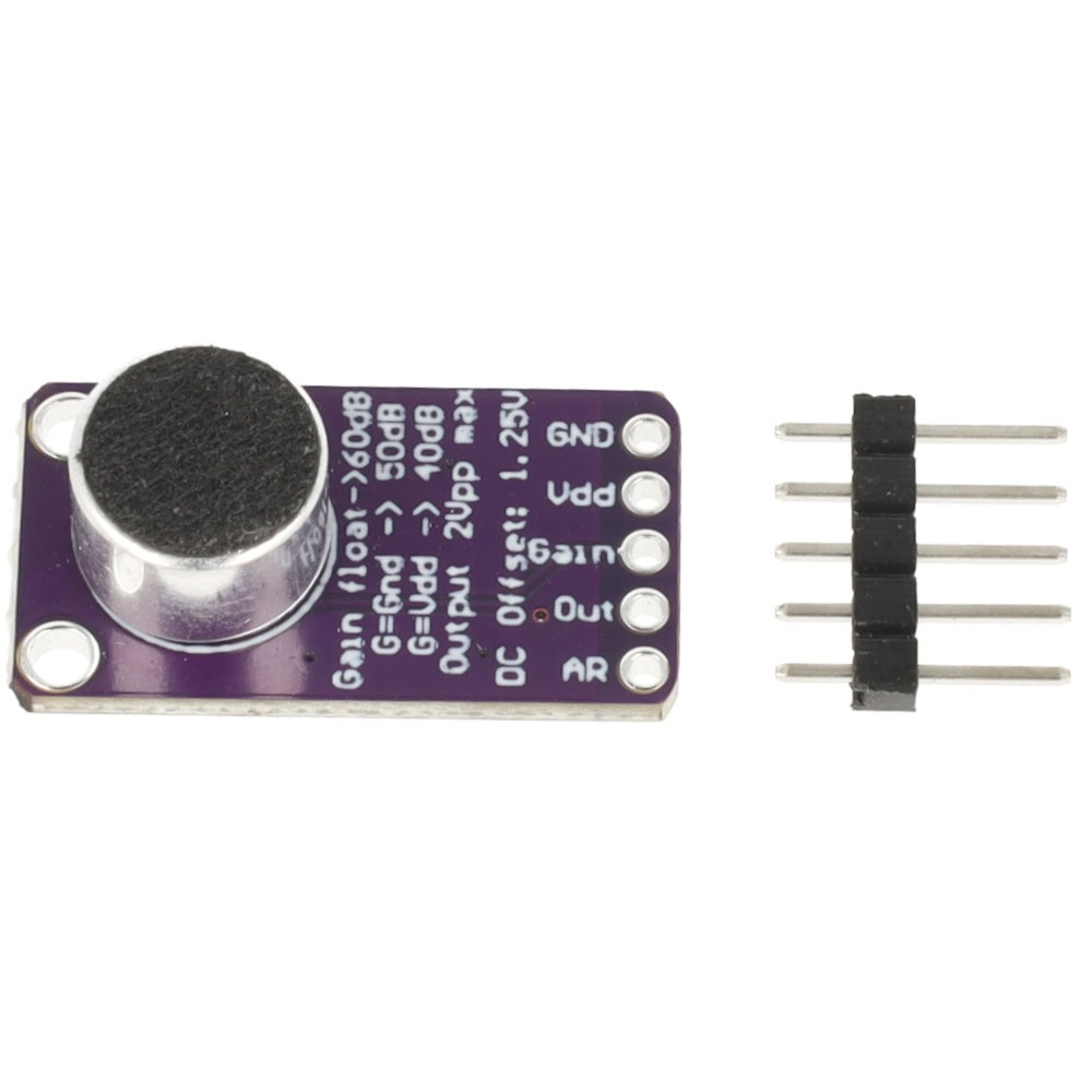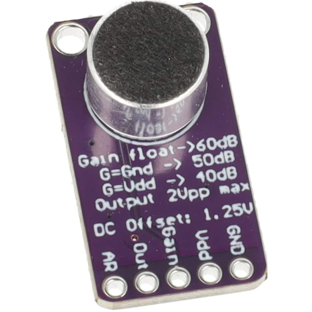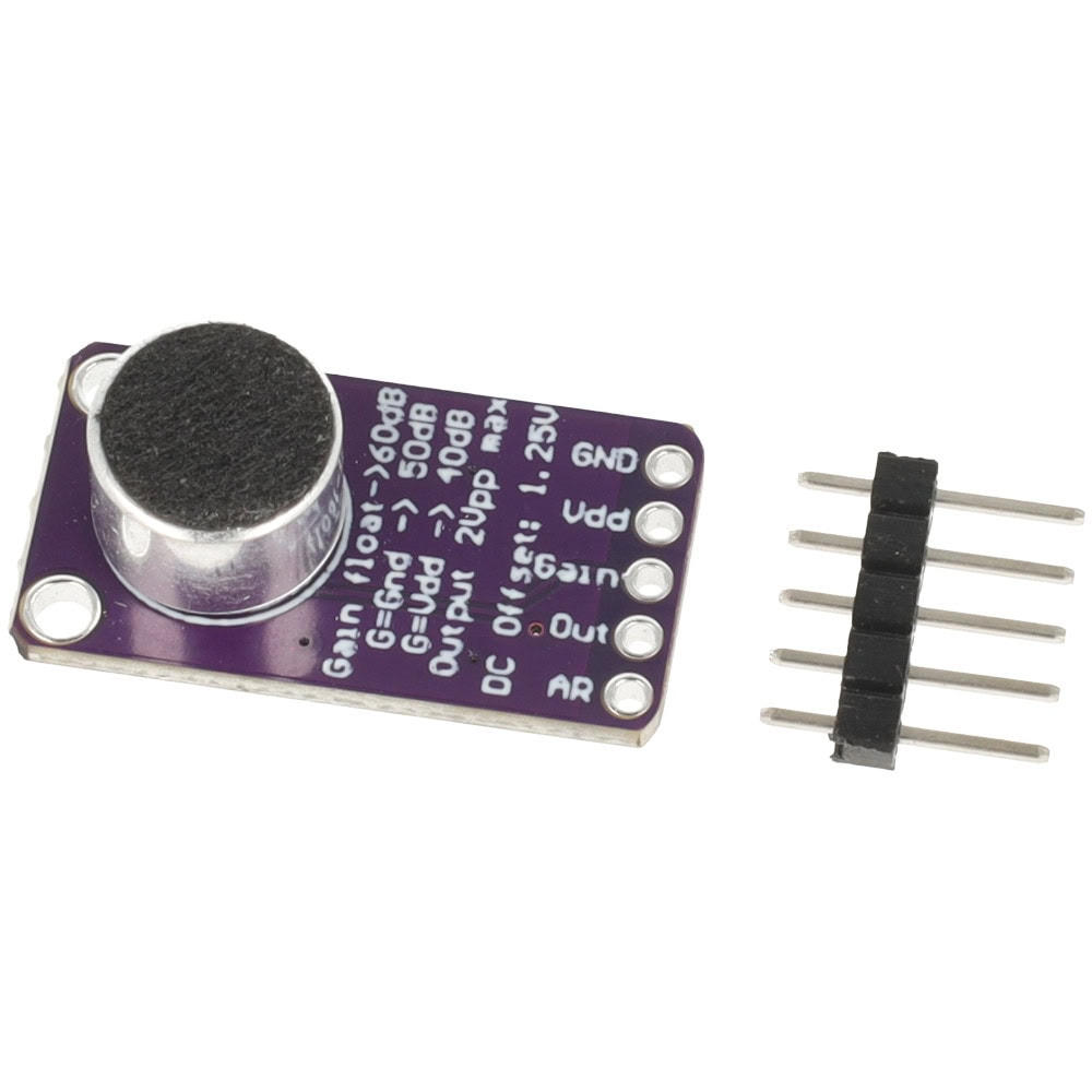 📶 Wzmacniacz: MAX9814 🔋 Napięcie zasilania: 2,7 ÷ 5 V ⚡ Pobór prądu: 3 mA 📤 Sygnał wyjściowy: 2 Vpp dla 1,25 V bias 🔕 Poziom szumów wejściowych: 30 nV 📉 Zniekształcenia THD: 0,04 % 🎵 Zakres częstotliwości: 20 Hz ÷ 20 kHz 🔄 Programowalny Attack/Release ratio 🔊 Maksymalne wzmocnienie: 40 dB / 50 dB / 60 dB 📏 Wymiary: 26 x 15 mm ⚖️ Waga: 2,31 g