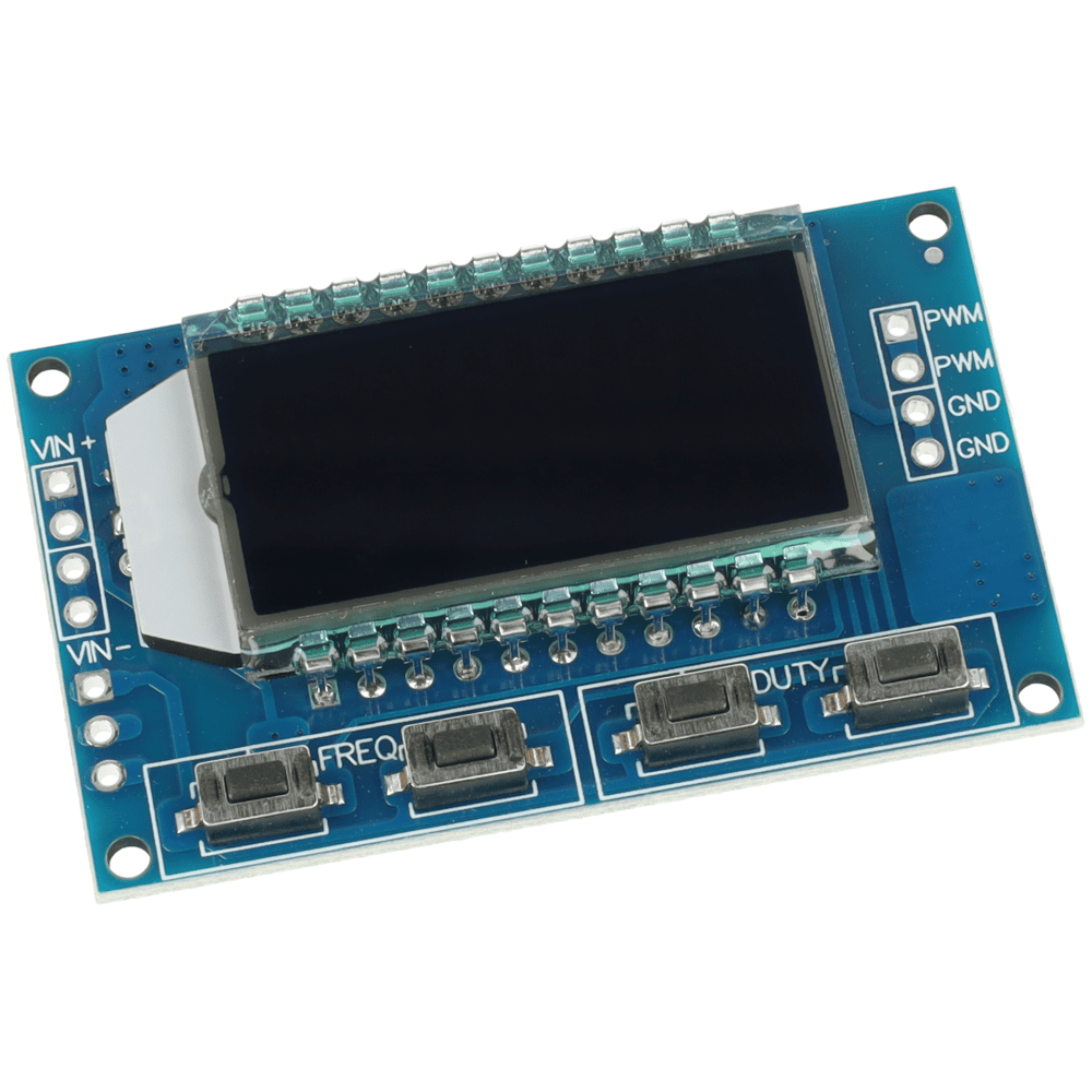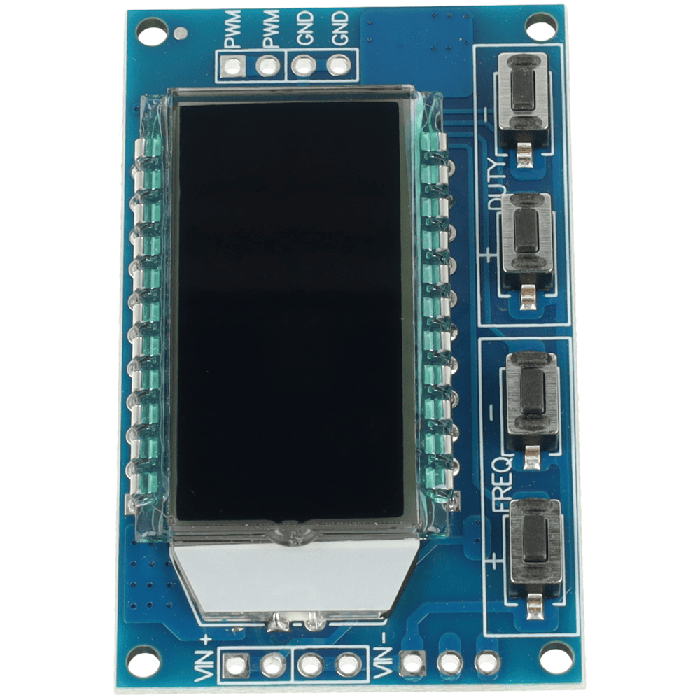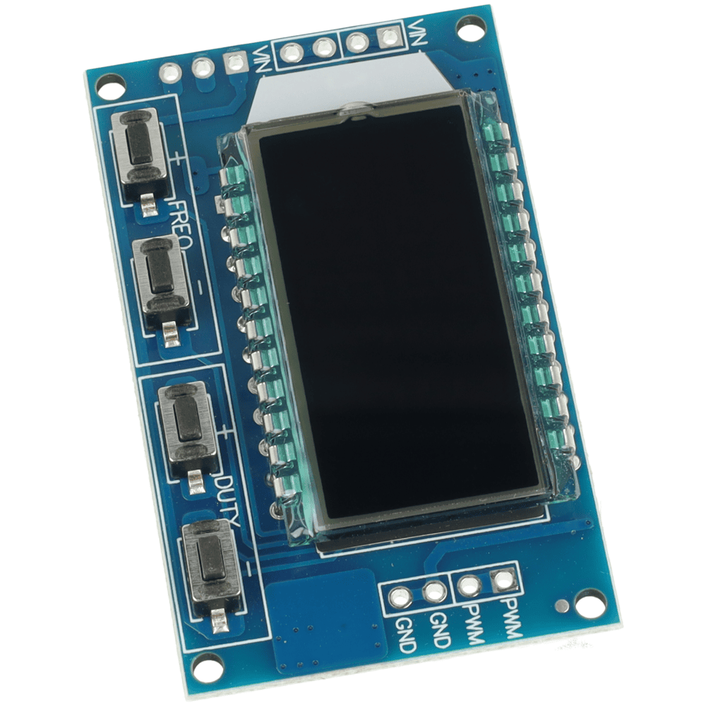 Moduł generatora sygnału PWM 1 Hz – 150 kHz z wyświetlaczem LCD umożliwia regulację częstotliwości w zakresie 1 Hz – 150 kHz oraz wypełnienia sygnału 0 – 100 %. Wyposażony w czytelny wyświetlacz LCD, obsługę przyciskami oraz komunikację szeregową TTL. Zasilanie 3,3 – 30 V, a amplituda wyjściowa PWM równa jest napięciu zasilania.