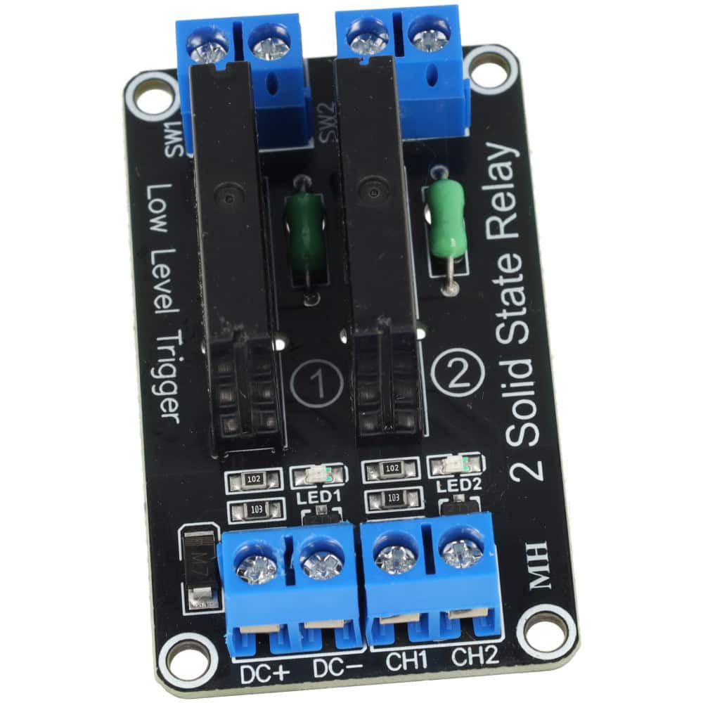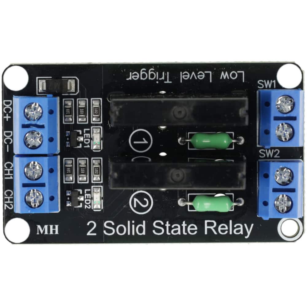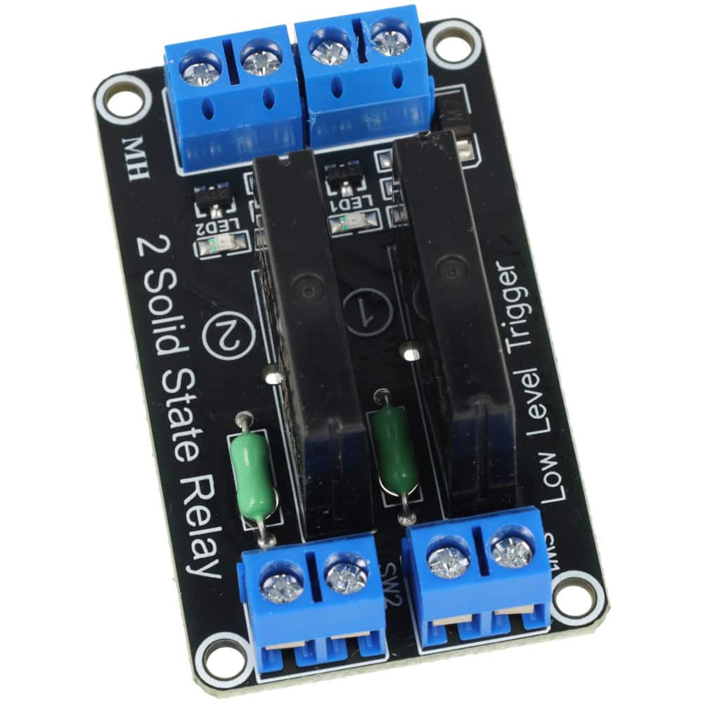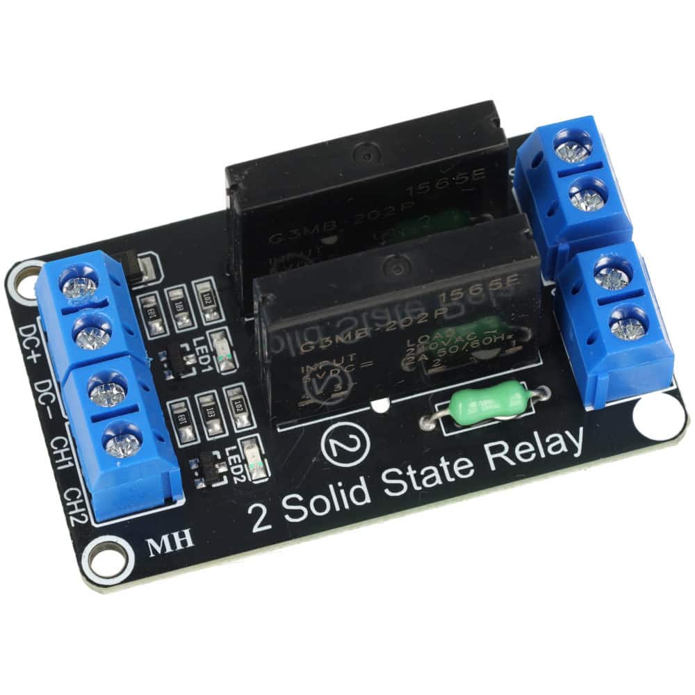 Dwukanałowy moduł przekaźników półprzewodnikowych SSR Solid State Relay o napięciu sterującym 5 V to doskonałe rozwiązanie do sterowania obciążeniem AC bez ryzyka mechanicznego zużycia.