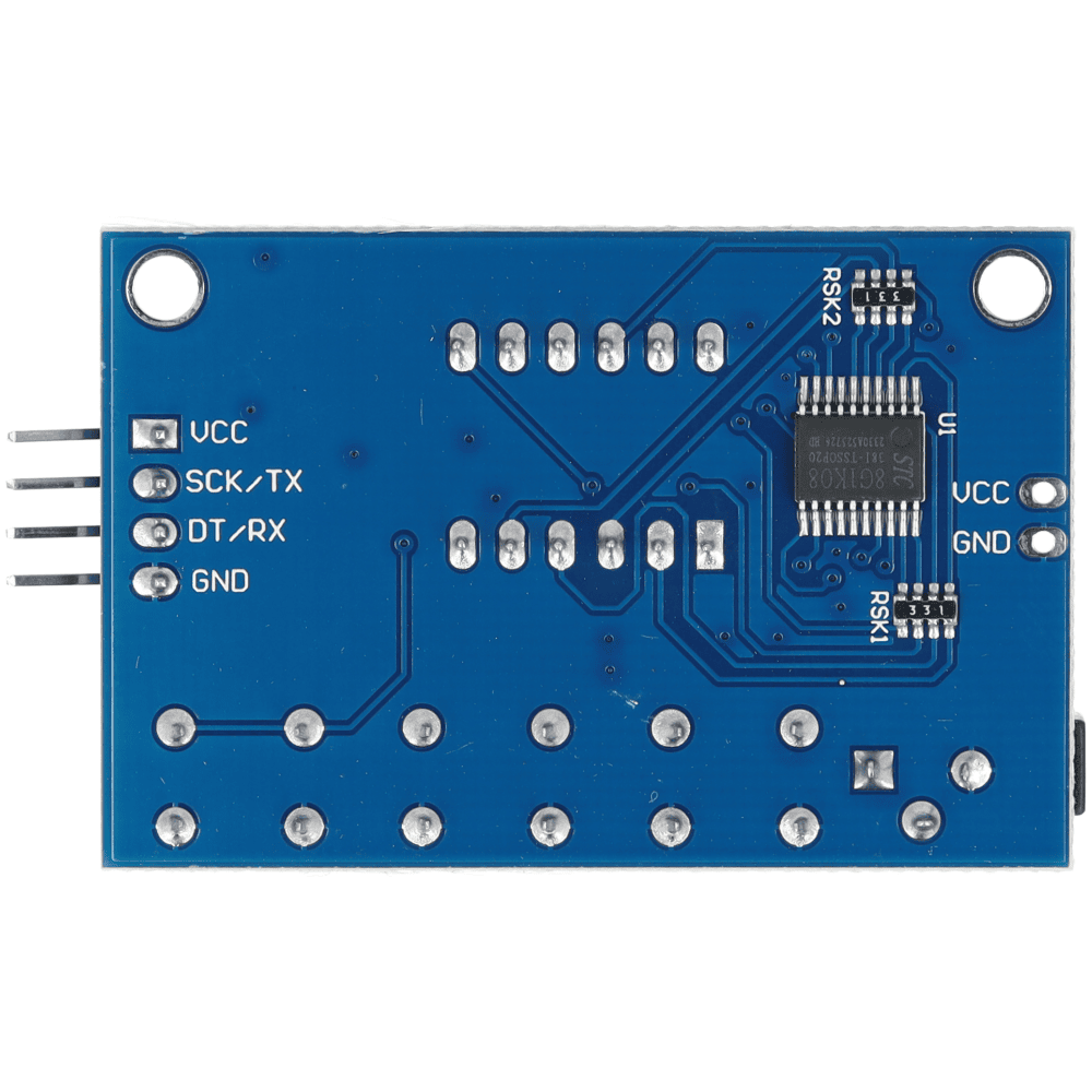 Pełna kompatybilność z HX711 Moduł współpracuje z popularnym przetwornikiem HX711, który odpowiada za precyzyjną konwersję sygnałów z czujników tensometrycznych.