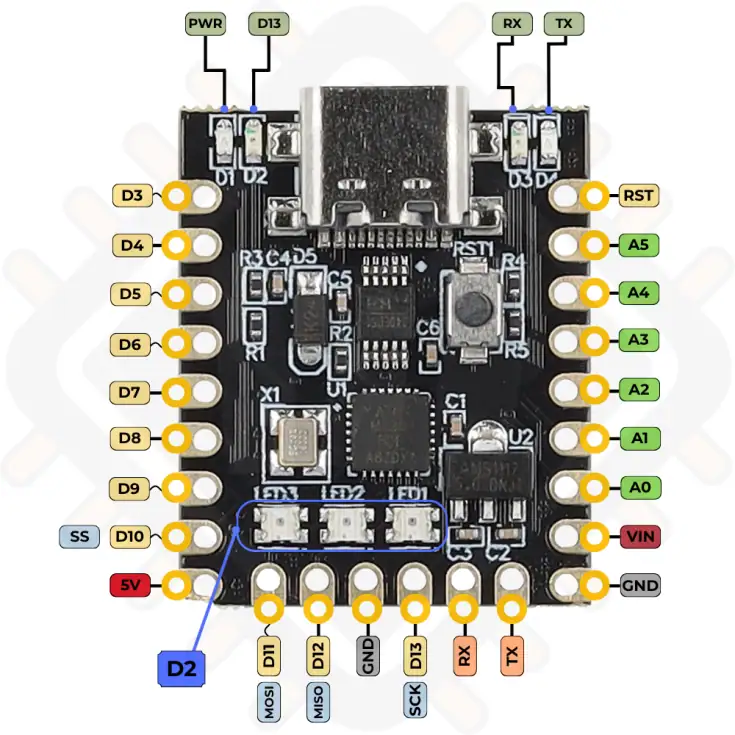 SuperMini Nano to moduł z układem ATmega328P zgodny z Arduino® Mikrokontroler posiada 32 kB pamięci Flash, 2 kB RAM i 1 kB EEPROM. Zegar taktowany jest częstotliwością 16 MHz.