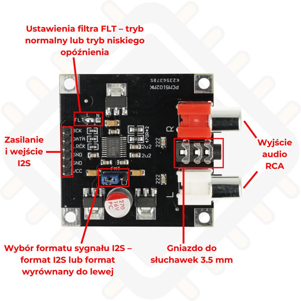 Moduł wspiera format I2S oraz format wyrównany do lewej Left Justified, przełączanie odbywa się ręcznie na płytce.