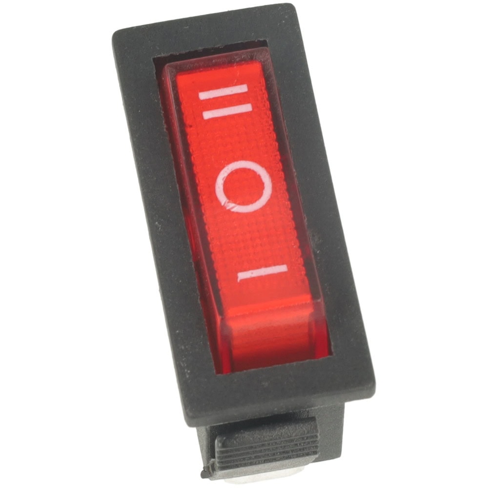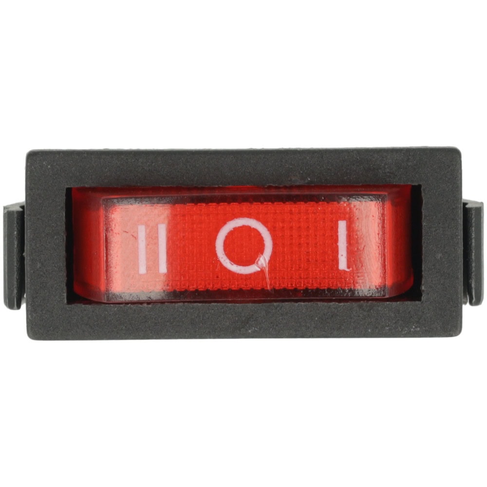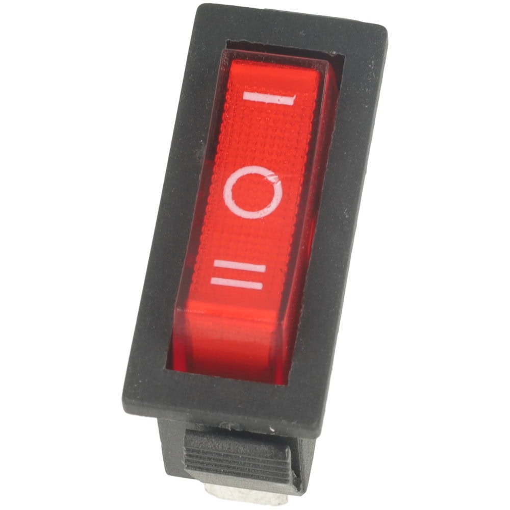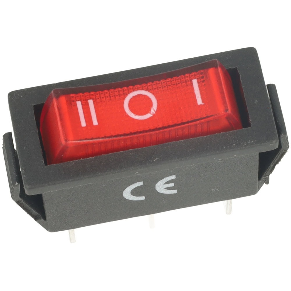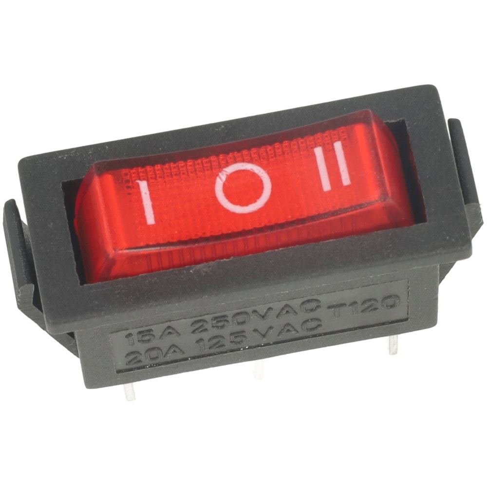 Przełącznik kołyskowy SPDT 3P w intensywnie czerwonym kolorze to niezawodny komponent elektryczny, który oferuje trzypozycyjne działanie: On I – Off – On II.