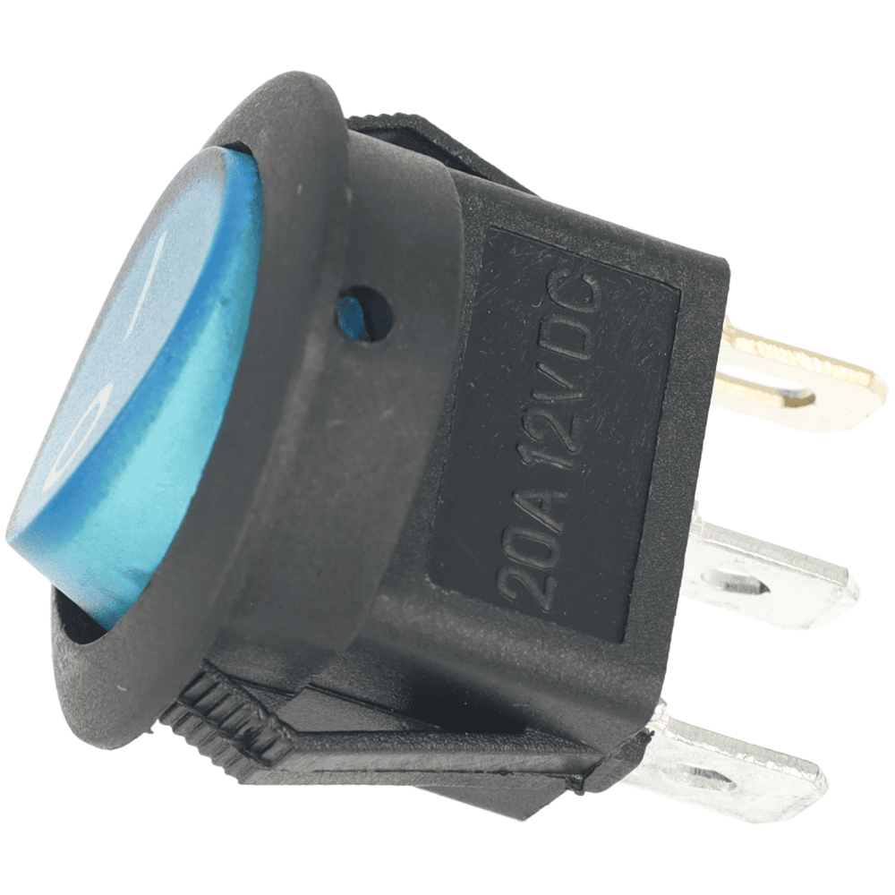 Przełącznik kołyskowy SPST to kompaktowe rozwiązanie do sterowania zasilaniem. Posiada 3 piny i funkcję On/Off, obsługuje obciążenia do 20 A przy 12 VDC. Średnica montażowa 20 mm ułatwia instalację, a niebieskie podświetlenie poprawia widoczność w ciemności.