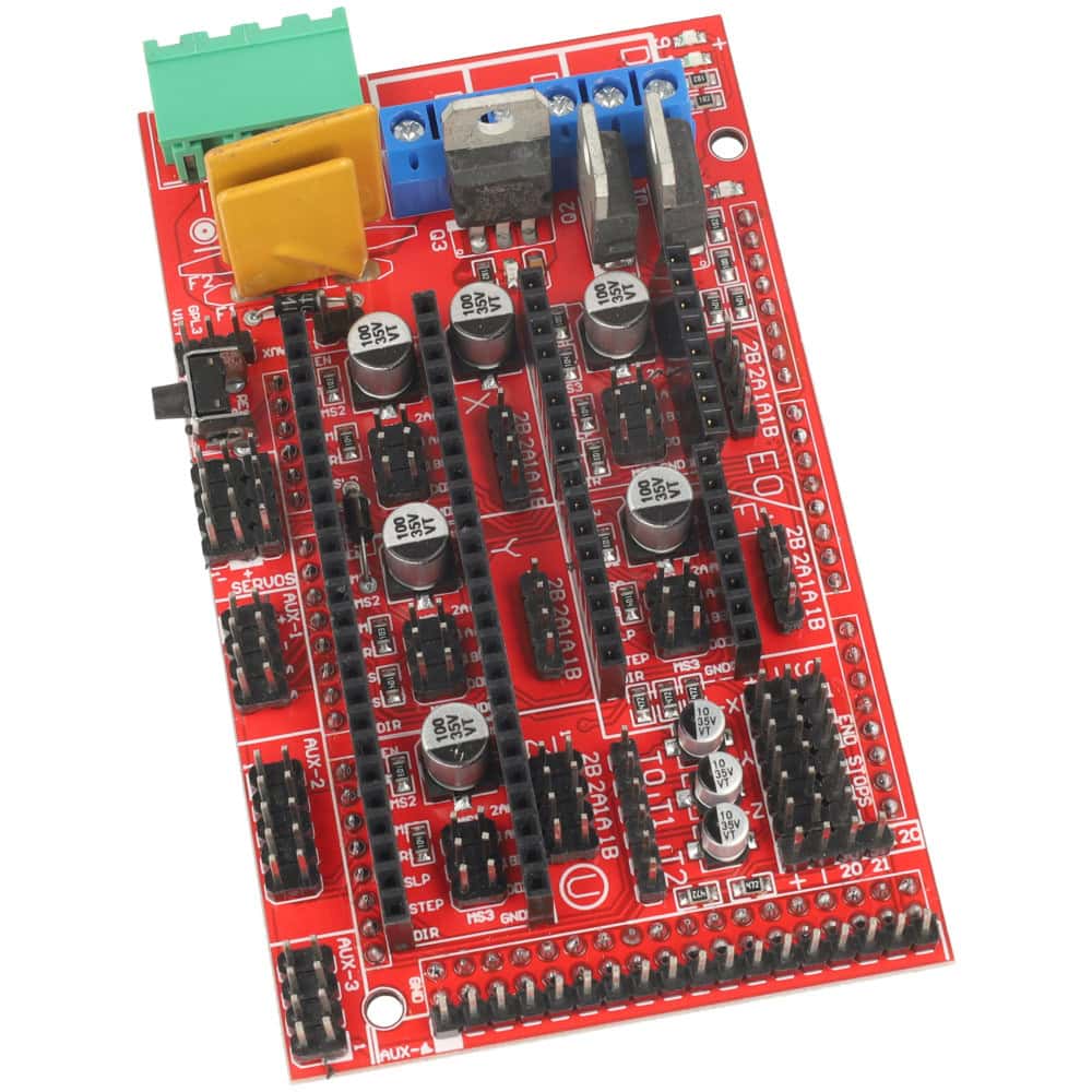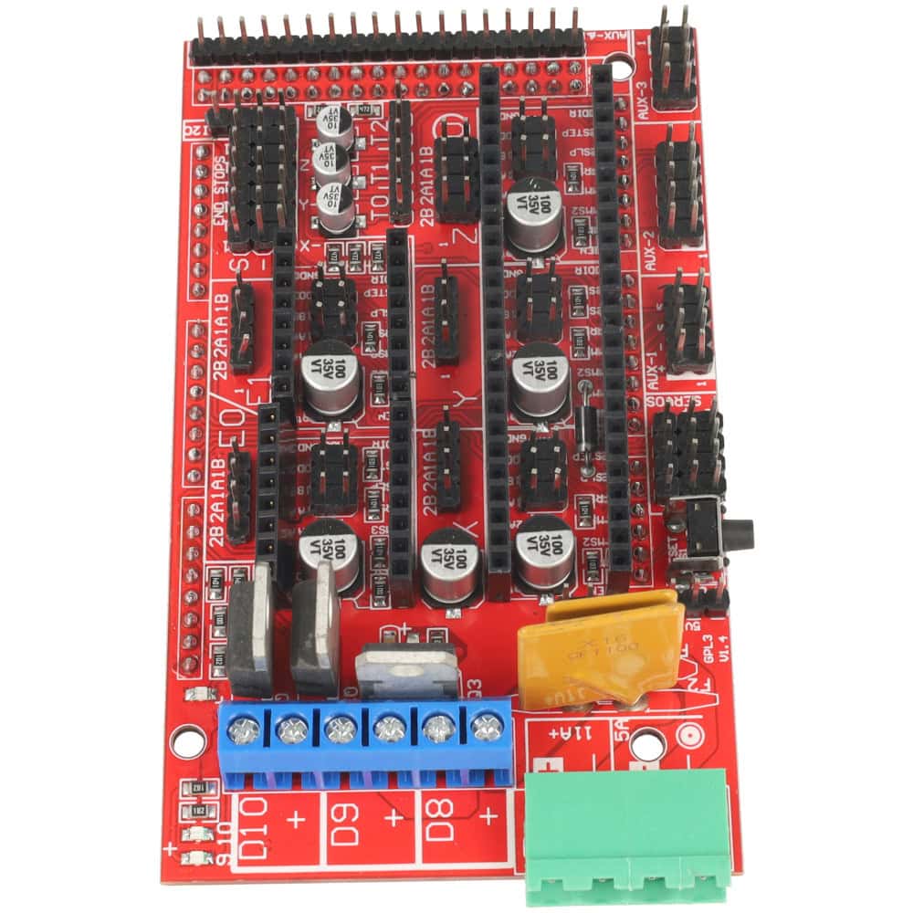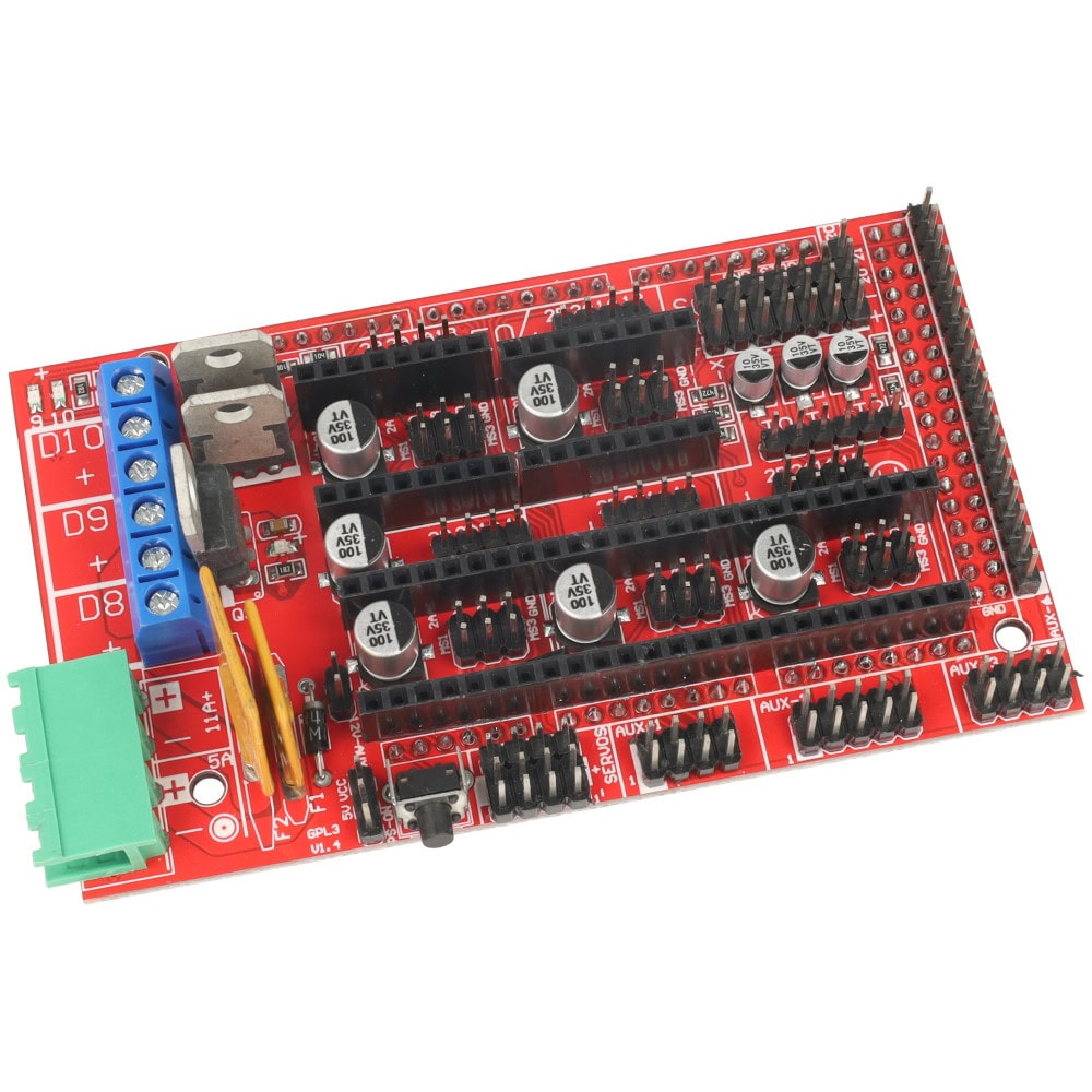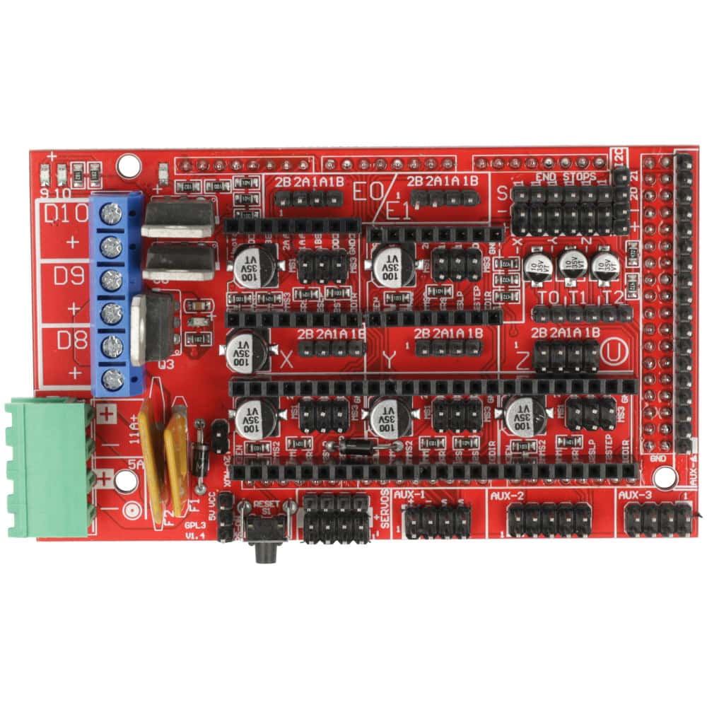 Posiada aż 5 slotów na sterowniki silników krokowych, 3 tranzystory MOSFET, 3 wejścia termistorów oraz złącza dla LCD, SD, SPI, I2C i serw.
