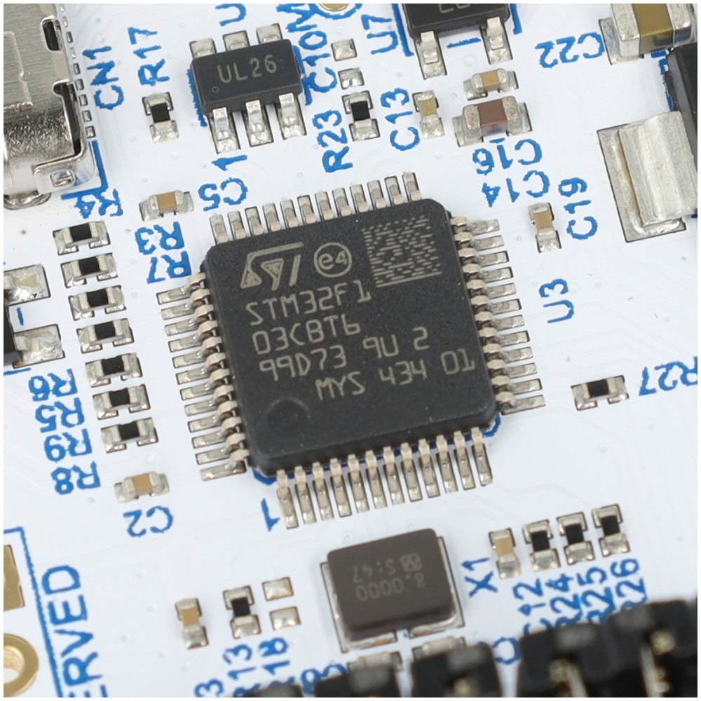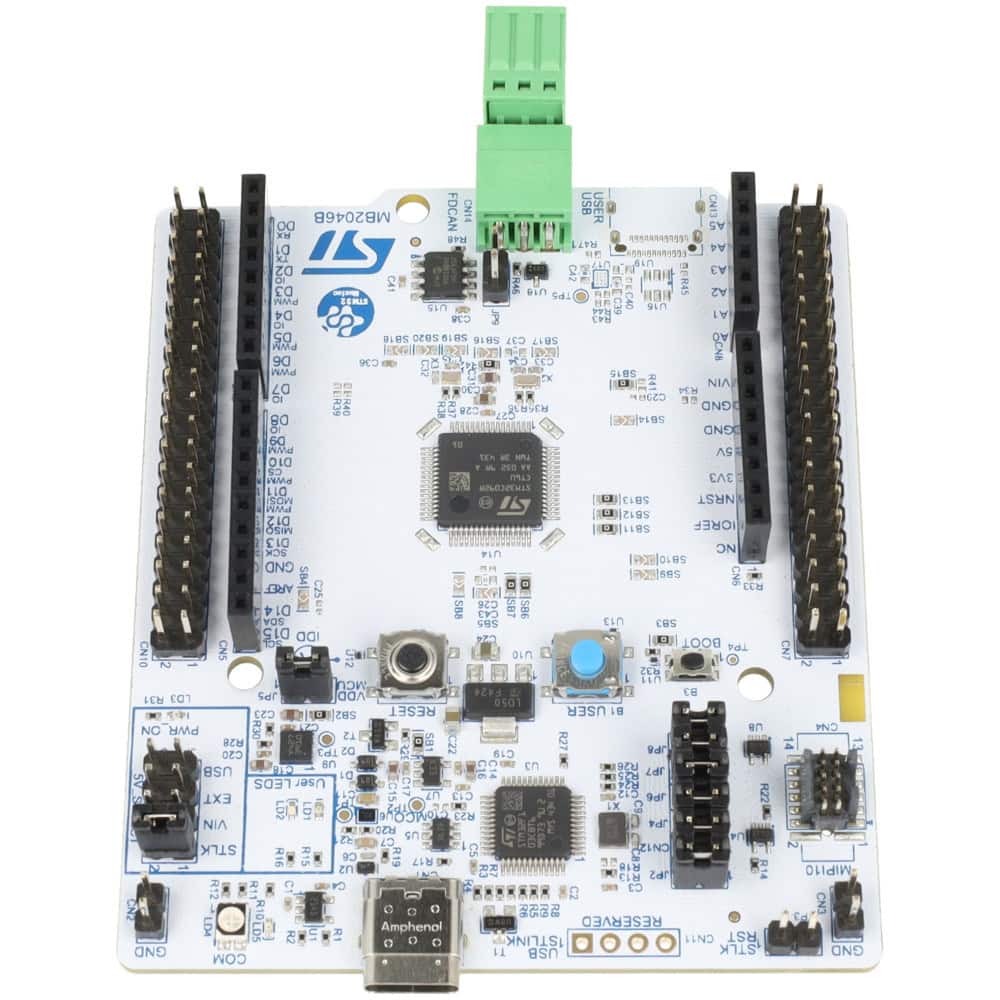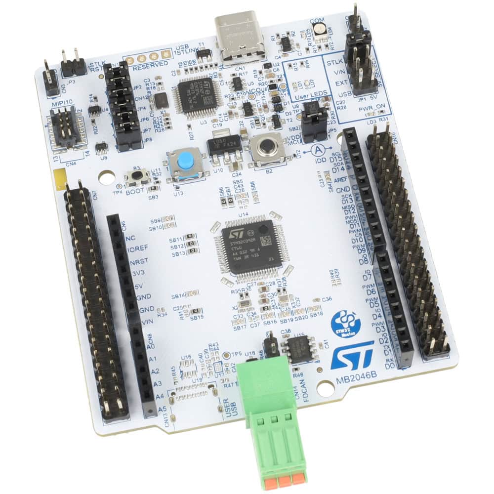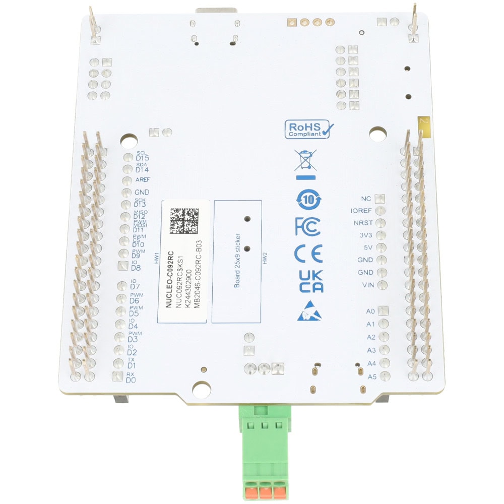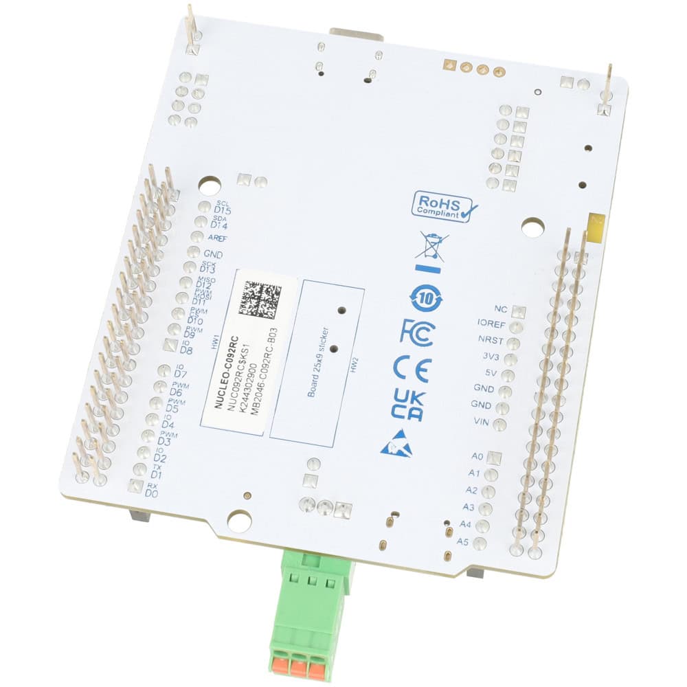 Zestaw ewaluacyjny NUCLEO-C092RC z mikrokontrolerem STM32C092RCT6. Układ oparty o rdzeń Arm Cortex-M0+ taktowany jest zegarem do 48 MHz i wyposażony w 256 kB pamięci Flash oraz 30 kB RAM z kontrolą parzystości. Na płytce znajdują się złącza zgodne z Arduino Uno R3 oraz ST Morpho. Wbudowany programator ST-Link/V2EC umożliwia programowanie i debugowanie układu oraz może być użyty z zewnętrznym mikrokontrolerem przez złącze MIPI-10 (STDC14). Płytka wyposażona jest w złącze USB-C do zasilania i programowania oraz posiada interfejs FDCAN do szybkiej komunikacji przemysłowej i motoryzacyjnej.