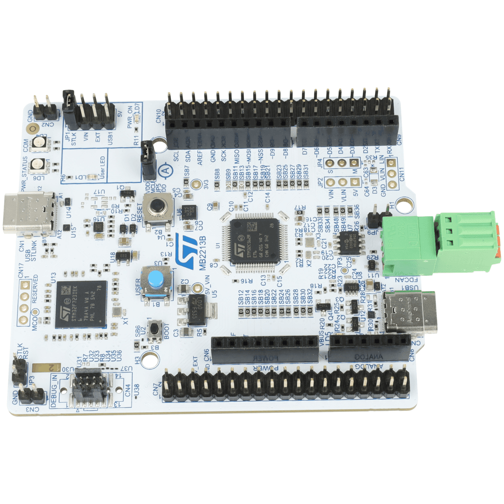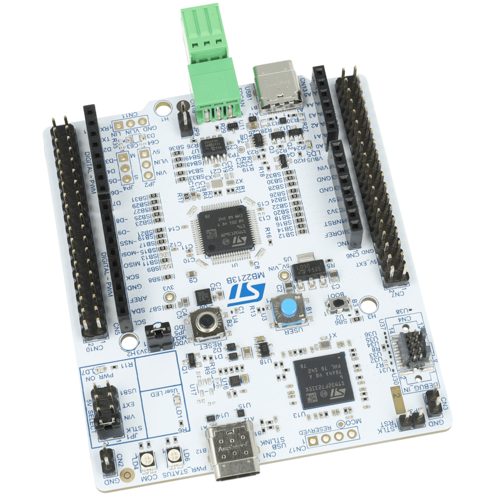 Zestaw ewaluacyjny NUCLEO-C562RE z mikrokontrolerem STM32C562RET6. Układ oparty o rdzeń Arm Cortex-M33 z jednostką FPU taktowany jest zegarem do 144 MHz i wyposażony w 512 kB pamięci Flash oraz 128 kB RAM. Na płytce znajdują się złącza zgodne z Arduino Uno R3 oraz ST Morpho. Wbudowany programator ST-LINK/V3EC umożliwia programowanie i debugowanie układu oraz może być użyty z zewnętrznym mikrokontrolerem przez złącze MIPI-10 STDC14. Płytka wyposażona jest w dwa złącza USB-C do zasilania, programowania oraz komunikacji ST-Link + USB FS, a także interfejs CAN FD z wbudowanym transceiverem, umożliwiający zastosowanie w systemach przemysłowych i motoryzacyjnych.
