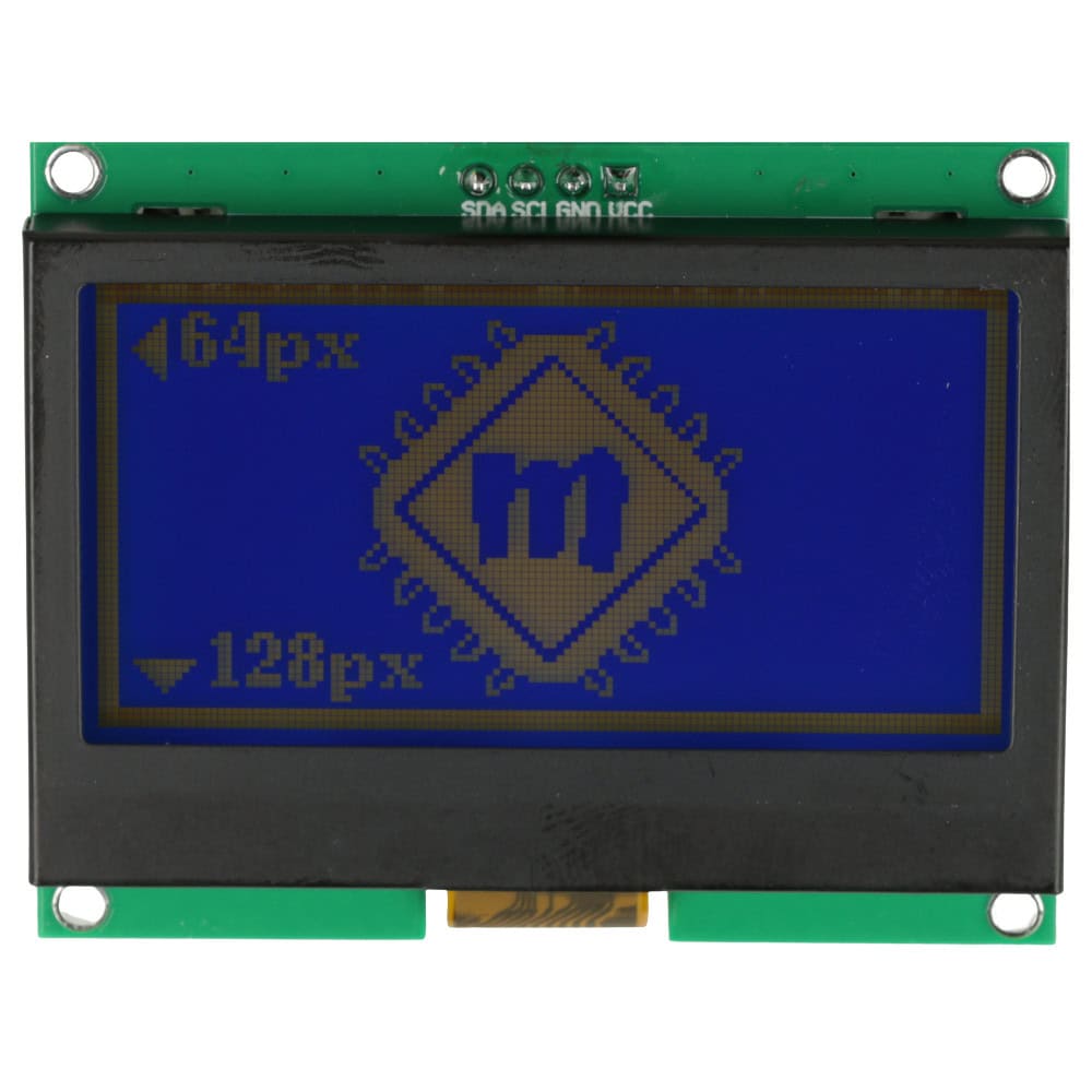 Wyświetlacz oferuje rozdzielczość 128×64 piksele i powierzchnię aktywną o wymiarach 48,62 × 24,3 mm. Przeznaczony do pracy w szerokim zakresie temperatur.