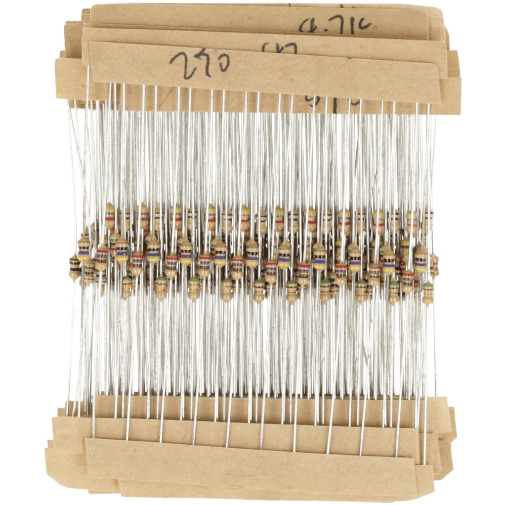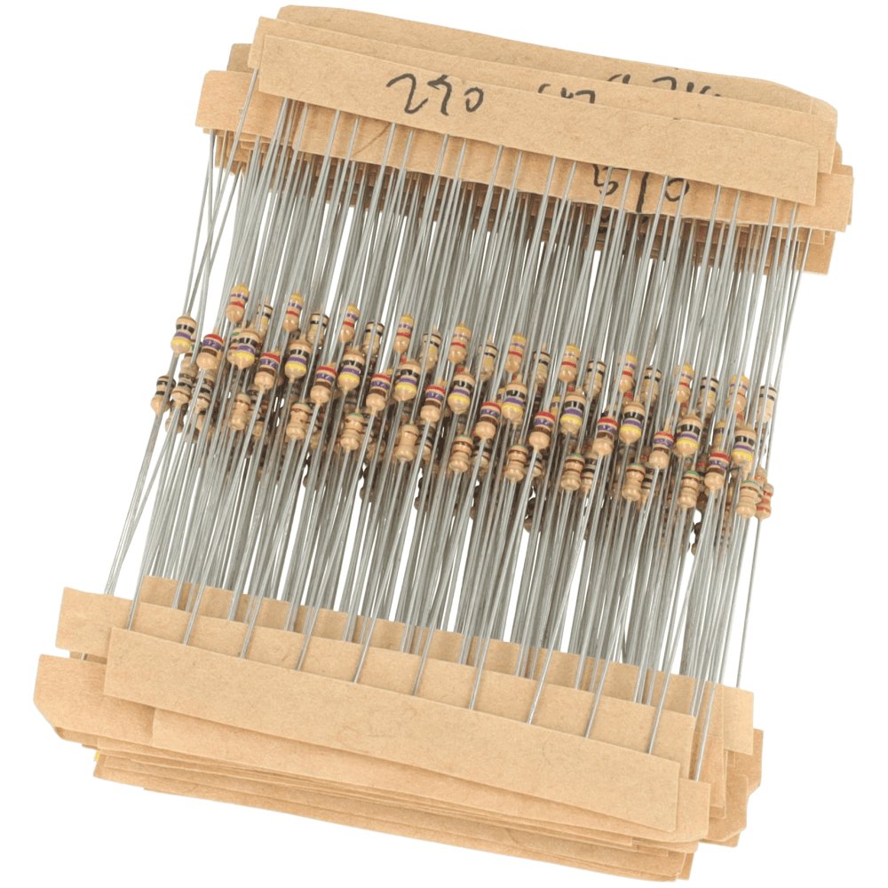 Praktyczny zestaw 300 rezystorów węglowych 1/4 W o tolerancji ± 5%, obejmujący 30 najpopularniejszych wartości od 10 Ω do 1 MΩ.