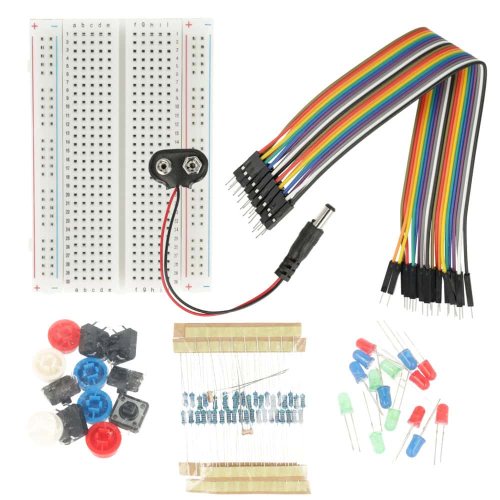 Zestaw startowy komponentów elektronicznych DIY do Arduino to praktyczny komplet do nauki elektroniki i budowy prostych oraz średnio zaawansowanych projektów. Zawiera rezystory, diody LED, fotorezystory, przełączniki, przewody połączeniowe, płytkę prototypową 400 punktów oraz kabel zasilający DC 9 V z wtyczką kątową 90°, kompatybilny z Arduino.