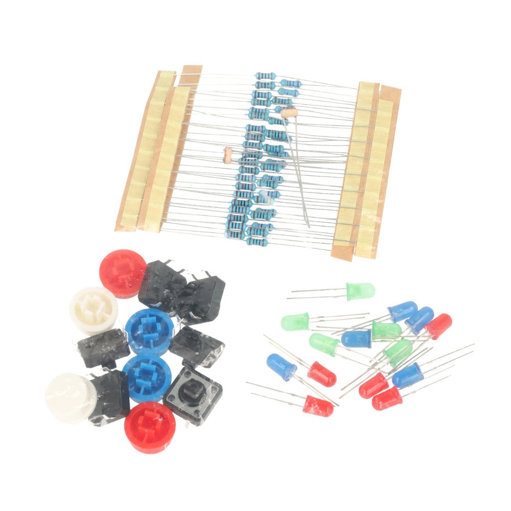 Zawiera podstawowe rezystory, diody LED, fotorezystory, przełączniki, przewody połączeniowe oraz płytkę prototypową 400 punktów.